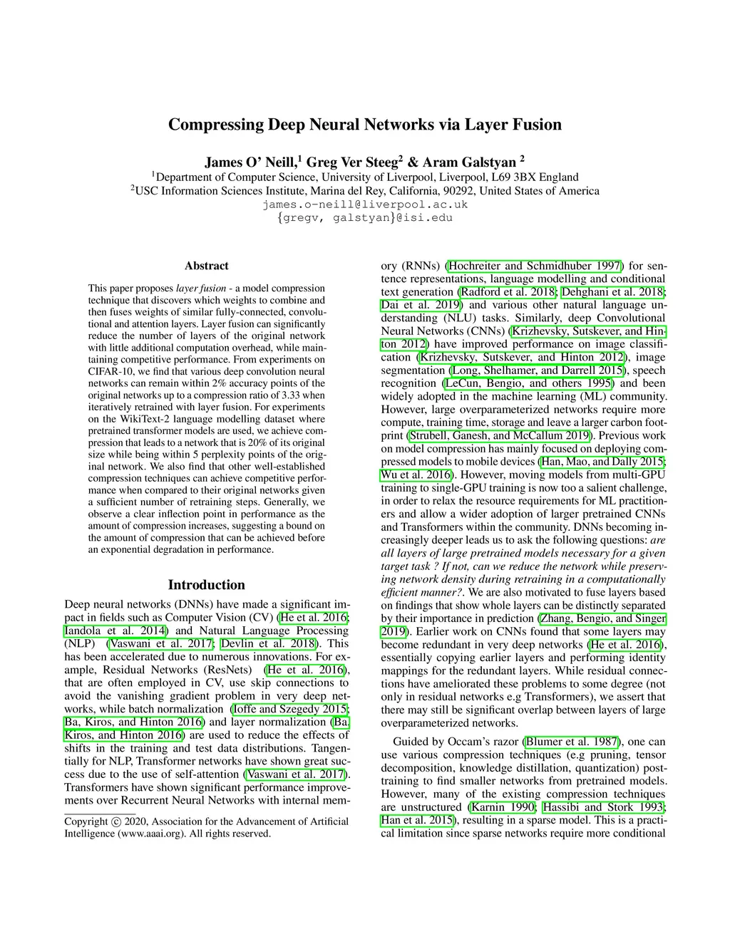 This paper proposes \textit{layer fusion} - a model compression technique that discovers which weights to combine and then fuses weights of similar fully-connected, convolutional and attention layers. Layer fusion can significantly reduce the number of layers of the original network with little additional computation overhead, while maintaining competitive performance. From experiments on CIFAR-10, we find that various deep convolution neural networks can remain within 2\% accuracy points of the original networks up to a compression ratio of 3.33 when iteratively retrained with layer fusion. For experiments on the WikiText-2 language modelling dataset where pretrained transformer models are used, we achieve compression that leads to a network that is 20\% of its original size while being within 5 perplexity points of the original network. We also find that other well-established compression techniques can achieve competitive performance when compared to their original networks given a sufficient number of retraining steps. Generally, we observe a clear inflection point in performance as the amount of compression increases, suggesting a bound on the amount of compression that can be achieved before an exponential degradation in performance.