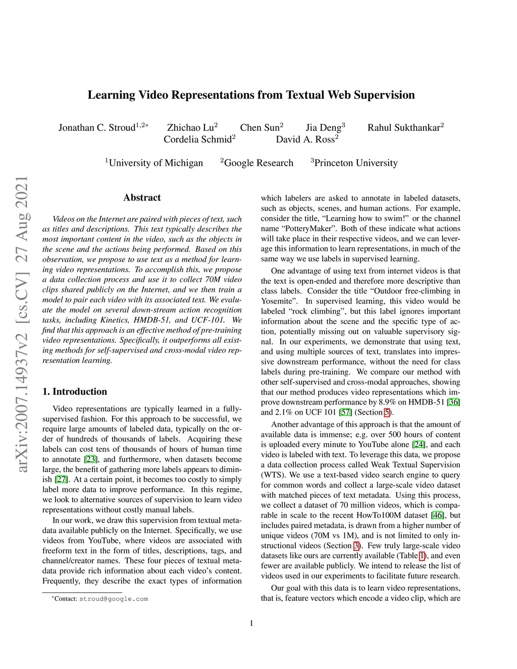 Videos on the Internet are paired with pieces of text, such as titles and descriptions. This text typically describes the most important content in the video, such as the objects in the scene and the actions being performed. Based on this observation, we propose to use text as a method for learning video representations. To accomplish this, we propose a data collection process and use it to collect 70M video clips shared publicly on the Internet, and we then train a model to pair each video with its associated text. We evaluate the model on several down-stream action recognition tasks, including Kinetics, HMDB-51, and UCF-101. We find that this approach is an effective method of pre-training video representations. Specifically, it outperforms all existing methods for self-supervised and cross-modal video representation learning.
