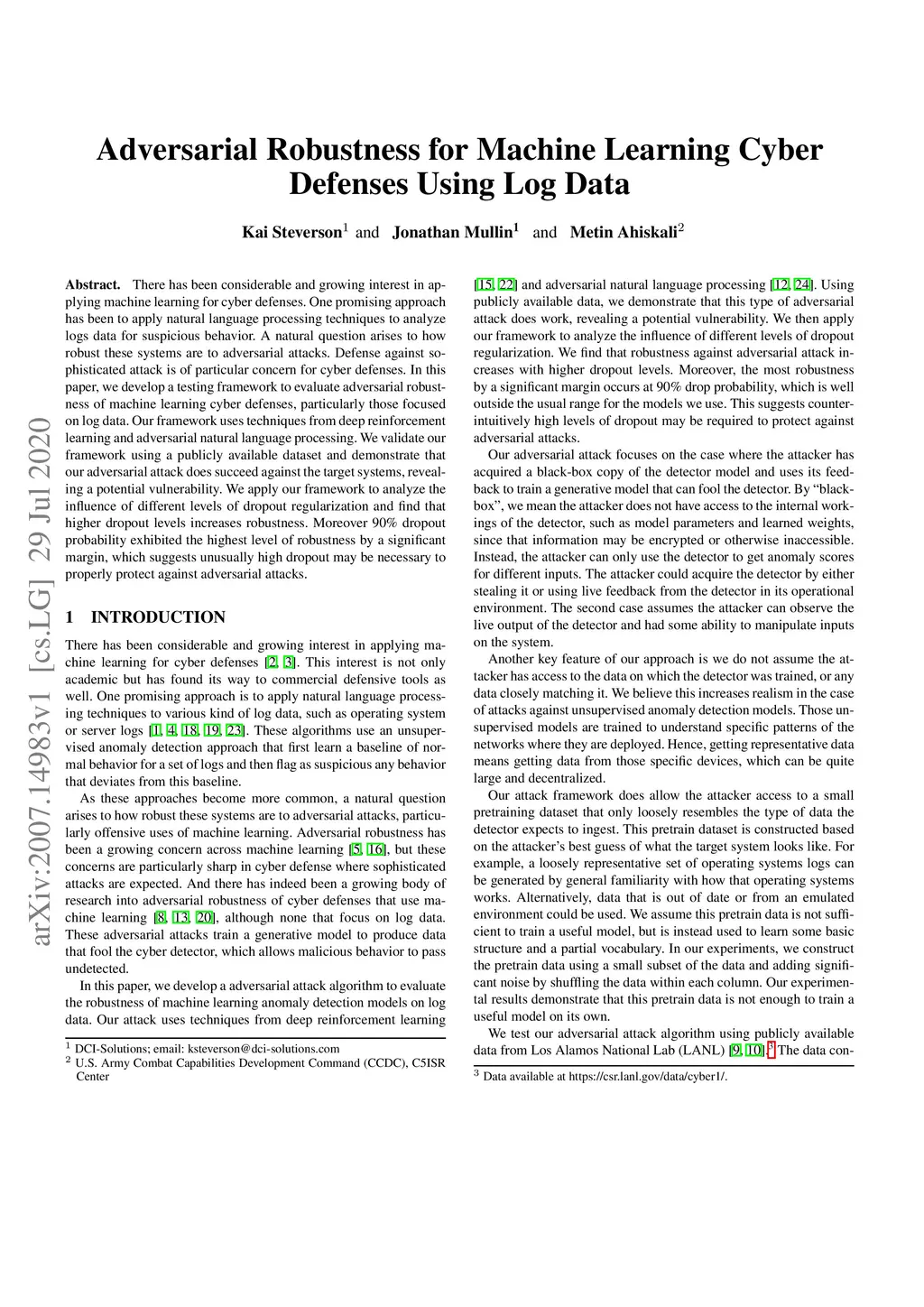 There has been considerable and growing interest in applying machine learning for cyber defenses. One promising approach has been to apply natural language processing techniques to analyze logs data for suspicious behavior. A natural question arises to how robust these systems are to adversarial attacks. Defense against sophisticated attack is of particular concern for cyber defenses. In this paper, we develop a testing framework to evaluate adversarial robustness of machine learning cyber defenses, particularly those focused on log data. Our framework uses techniques from deep reinforcement learning and adversarial natural language processing. We validate our framework using a publicly available dataset and demonstrate that our adversarial attack does succeed against the target systems, revealing a potential vulnerability. We apply our framework to analyze the influence of different levels of dropout regularization and find that higher dropout levels increases robustness. Moreover 90% dropout probability exhibited the highest level of robustness by a significant margin, which suggests unusually high dropout may be necessary to properly protect against adversarial attacks.
