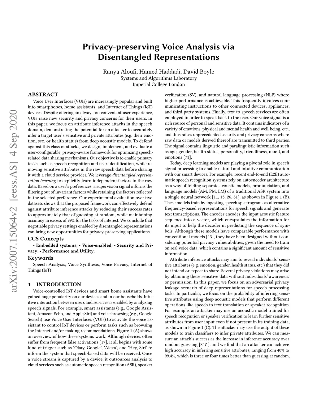 Privacy-preserving Voice Analysis via Disentangled Representations