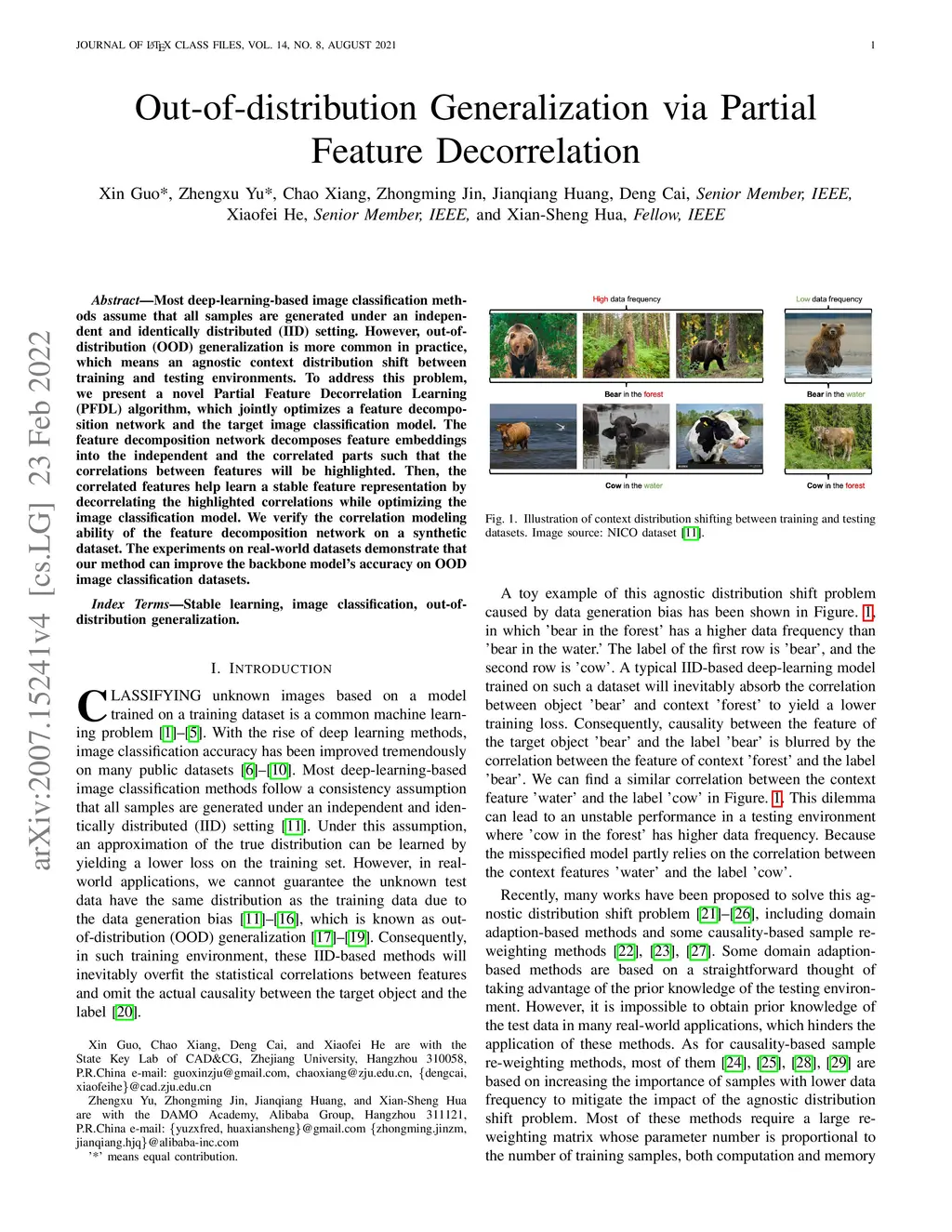 Most deep-learning-based image classification methods assume that all samples are generated under an independent and identically distributed (IID) setting. However, out-of-distribution (OOD) generalization is more common in practice, which means an agnostic context distribution shift between training and testing environments. To address this problem, we present a novel Partial Feature Decorrelation Learning (PFDL) algorithm, which jointly optimizes a feature decomposition network and the target image classification model. The feature decomposition network decomposes feature embeddings into the independent and the correlated parts such that the correlations between features will be highlighted. Then, the correlated features help learn a stable feature representation by decorrelating the highlighted correlations while optimizing the image classification model. We verify the correlation modeling ability of the feature decomposition network on a synthetic dataset. The experiments on real-world datasets demonstrate that our method can improve the backbone model's accuracy on OOD image classification datasets.