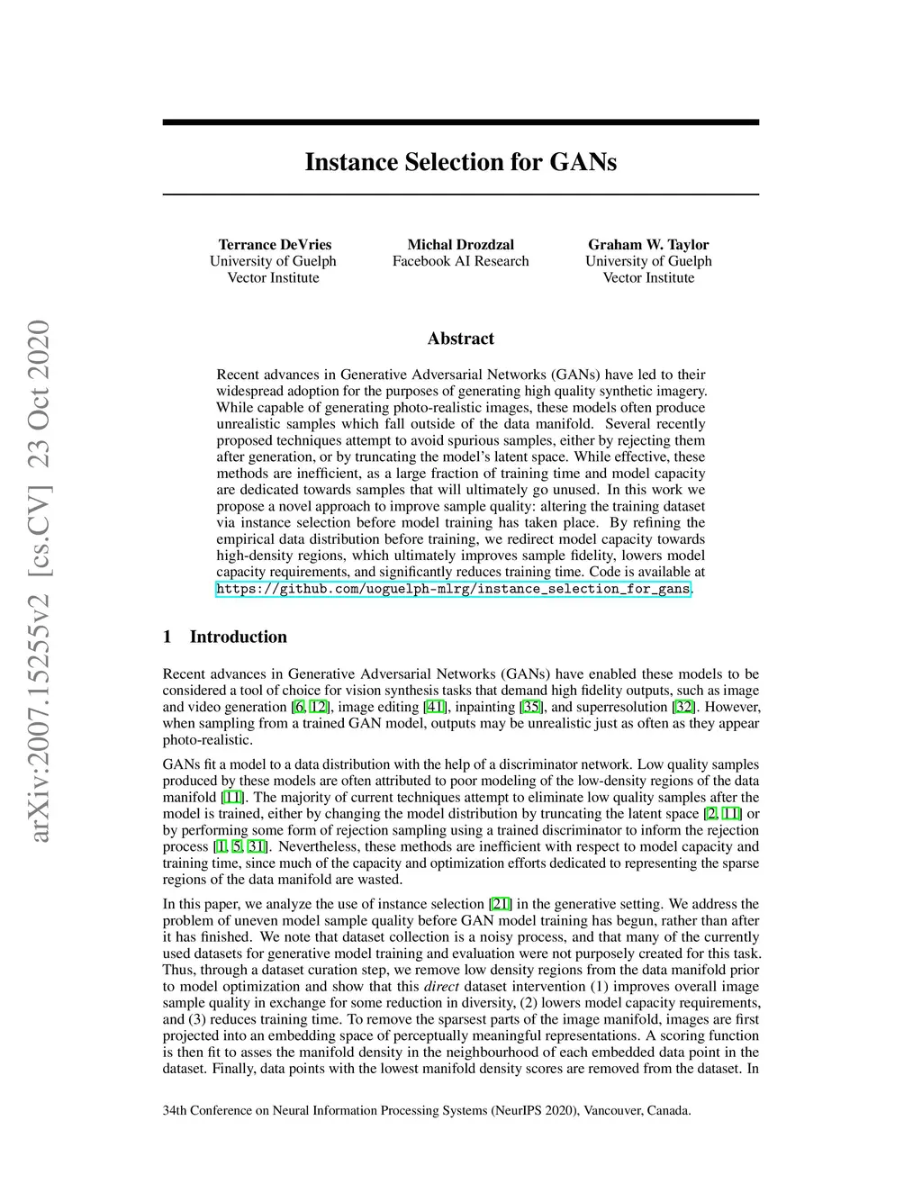Recent advances in Generative Adversarial Networks (GANs) have led to their widespread adoption for the purposes of generating high quality synthetic imagery. While capable of generating photo-realistic images, these models often produce unrealistic samples which fall outside of the data manifold. Several recently proposed techniques attempt to avoid spurious samples, either by rejecting them after generation, or by truncating the model's latent space. While effective, these methods are inefficient, as a large fraction of training time and model capacity are dedicated towards samples that will ultimately go unused. In this work we propose a novel approach to improve sample quality: altering the training dataset via instance selection before model training has taken place. By refining the empirical data distribution before training, we redirect model capacity towards high-density regions, which ultimately improves sample fidelity, lowers model capacity requirements, and significantly reduces training time. Code is available at https://github.com/uoguelph-mlrg/instance_selection_for_gans.