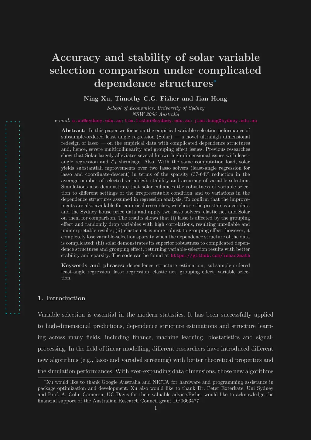 In this paper we focus on the empirical variable-selection peformance of subsample-ordered least angle regression (Solar) -- a novel ultrahigh dimensional redesign of lasso -- on the empirical data with complicated dependence structures and, hence, severe multicollinearity and grouping effect issues. Previous researches show that Solar largely alleviates several known high-dimensional issues with least-angle regression and shrinkage. Also, With the same computation load, solar yields substantiali mprovements over two lasso solvers (least-angle regression for lasso and coordinate-descent) in terms of the sparsity (37-64\% reduction in the average number of selected variables), stability and accuracy of variable selection. Simulations also demonstrate that solar enhances the robustness of variable selection to different settings of the irrepresentable condition and to variations in the dependence structures assumed in regression analysis. To confirm that the improvements are also available for empirical researches, we choose the prostate cancer data and the Sydney house price data and apply two lasso solvers, elastic net and Solar on them for comparison. The results shows that (i) lasso is affected by the grouping effect and randomly drop variables with high correlations, resulting unreliable and uninterpretable results; (ii) elastic net is more robust to grouping effect; however, it completely lose variable-selection sparsity when the dependence structure of the data is complicated; (iii) solar demonstrates its superior robustness to complicated dependence structures and grouping effect, returning variable-selection results with better stability and sparsity. The code can be found at https://github.com/isaac2math/solar_application