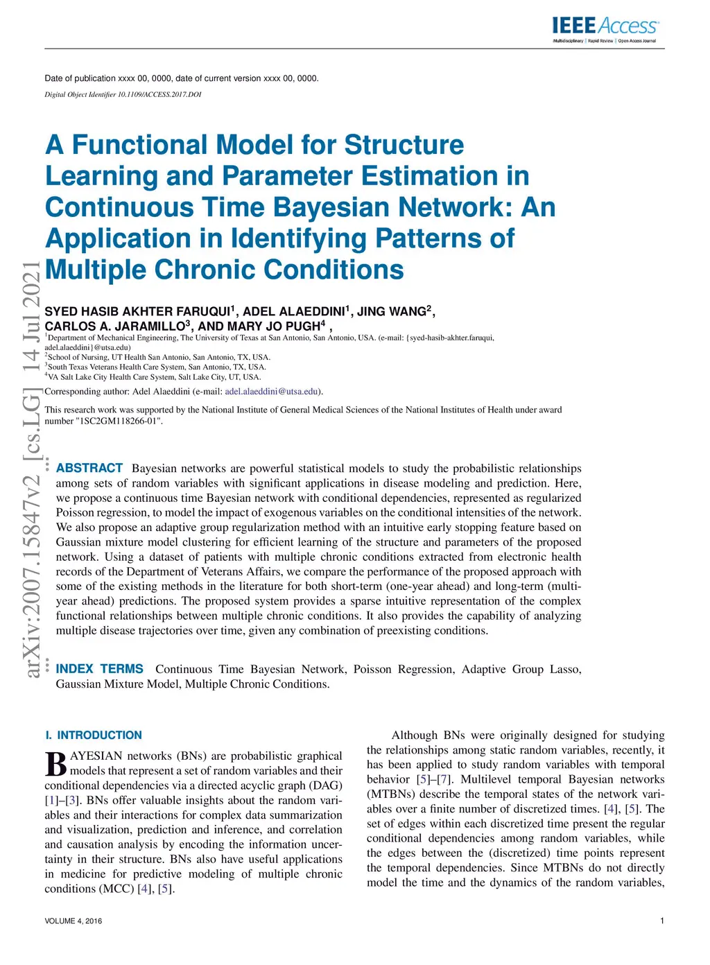 Bayesian networks are powerful statistical models to study the probabilistic relationships among set random variables with major applications in disease modeling and prediction. Here, we propose a continuous time Bayesian network with conditional dependencies, represented as Poisson regression, to model the impact of exogenous variables on the conditional dependencies of the network. We also propose an adaptive regularization method with an intuitive early stopping feature based on density based clustering for efficient learning of the structure and parameters of the proposed network. Using a dataset of patients with multiple chronic conditions extracted from electronic health records of the Department of Veterans Affairs we compare the performance of the proposed approach with some of the existing methods in the literature for both short-term (one-year ahead) and long-term (multi-year ahead) predictions. The proposed approach provides a sparse intuitive representation of the complex functional relationships between multiple chronic conditions. It also provides the capability of analyzing multiple disease trajectories over time given any combination of prior conditions.
