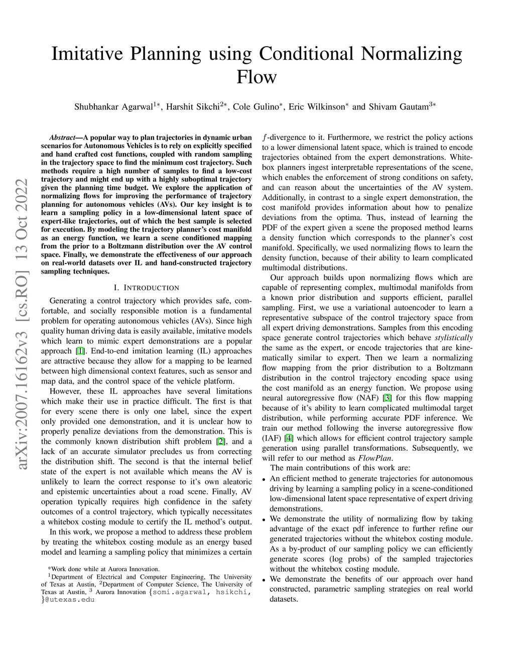 A popular way to plan trajectories in dynamic urban scenarios for Autonomous Vehicles is to rely on explicitly specified and hand crafted cost functions, coupled with random sampling in the trajectory space to find the minimum cost trajectory. Such methods require a high number of samples to find a low-cost trajectory and might end up with a highly suboptimal trajectory given the planning time budget. We explore the application of normalizing flows for improving the performance of trajectory planning for autonomous vehicles (AVs). Our key insight is to learn a sampling policy in a low-dimensional latent space of expert-like trajectories, out of which the best sample is selected for execution. By modeling the trajectory planner's cost manifold as an energy function, we learn a scene conditioned mapping from the prior to a Boltzmann distribution over the AV control space. Finally, we demonstrate the effectiveness of our approach on real-world datasets over IL and hand-constructed trajectory sampling techniques.