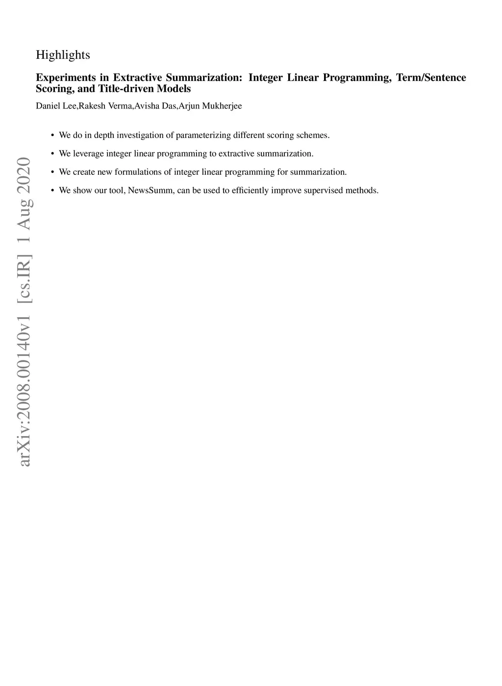 Experiments in Extractive Summarization: Integer Linear Programming,
