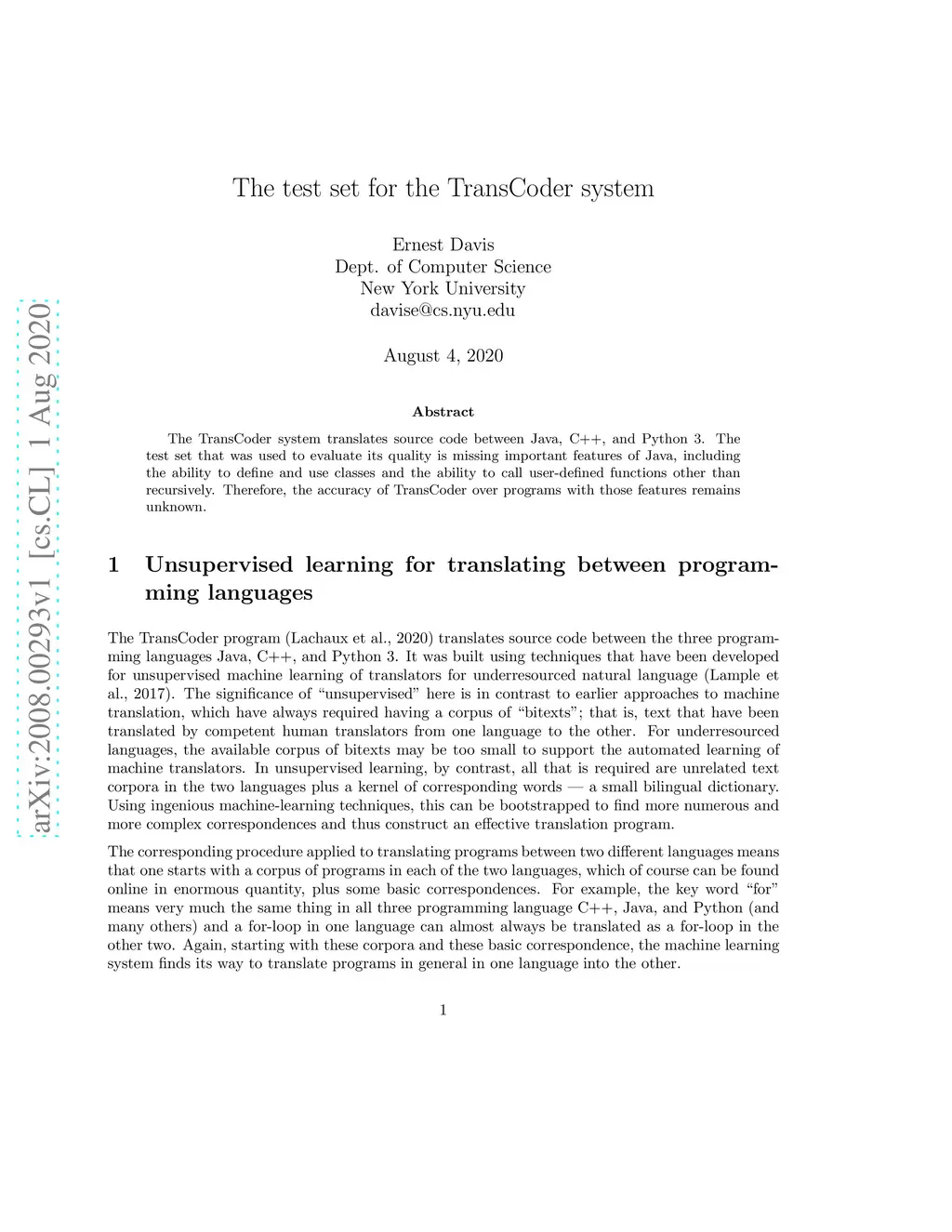 The TransCoder system translates source code between Java, C++, and Python 3. The test set that was used to evaluate its quality is missing important features of Java, including the ability to define and use classes and the ability to call user-defined functions other than recursively. Therefore, the accuracy of TransCoder over programs with those features remains unknown.