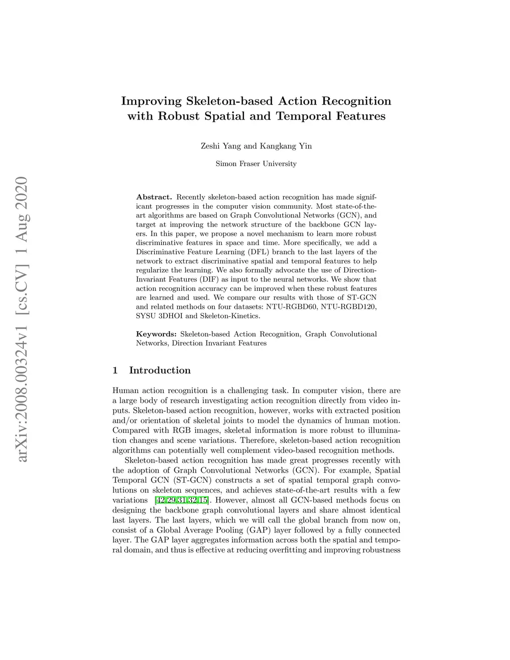 Recently skeleton-based action recognition has made signif-icant progresses in the computer vision community. Most state-of-the-art algorithms are based on Graph Convolutional Networks (GCN), andtarget at improving the network structure of the backbone GCN lay-ers. In this paper, we propose a novel mechanism to learn more robustdiscriminative features in space and time. More specifically, we add aDiscriminative Feature Learning (DFL) branch to the last layers of thenetwork to extract discriminative spatial and temporal features to helpregularize the learning. We also formally advocate the use of Direction-Invariant Features (DIF) as input to the neural networks. We show thataction recognition accuracy can be improved when these robust featuresare learned and used. We compare our results with those of ST-GCNand related methods on four datasets: NTU-RGBD60, NTU-RGBD120,SYSU 3DHOI and Skeleton-Kinetics.
