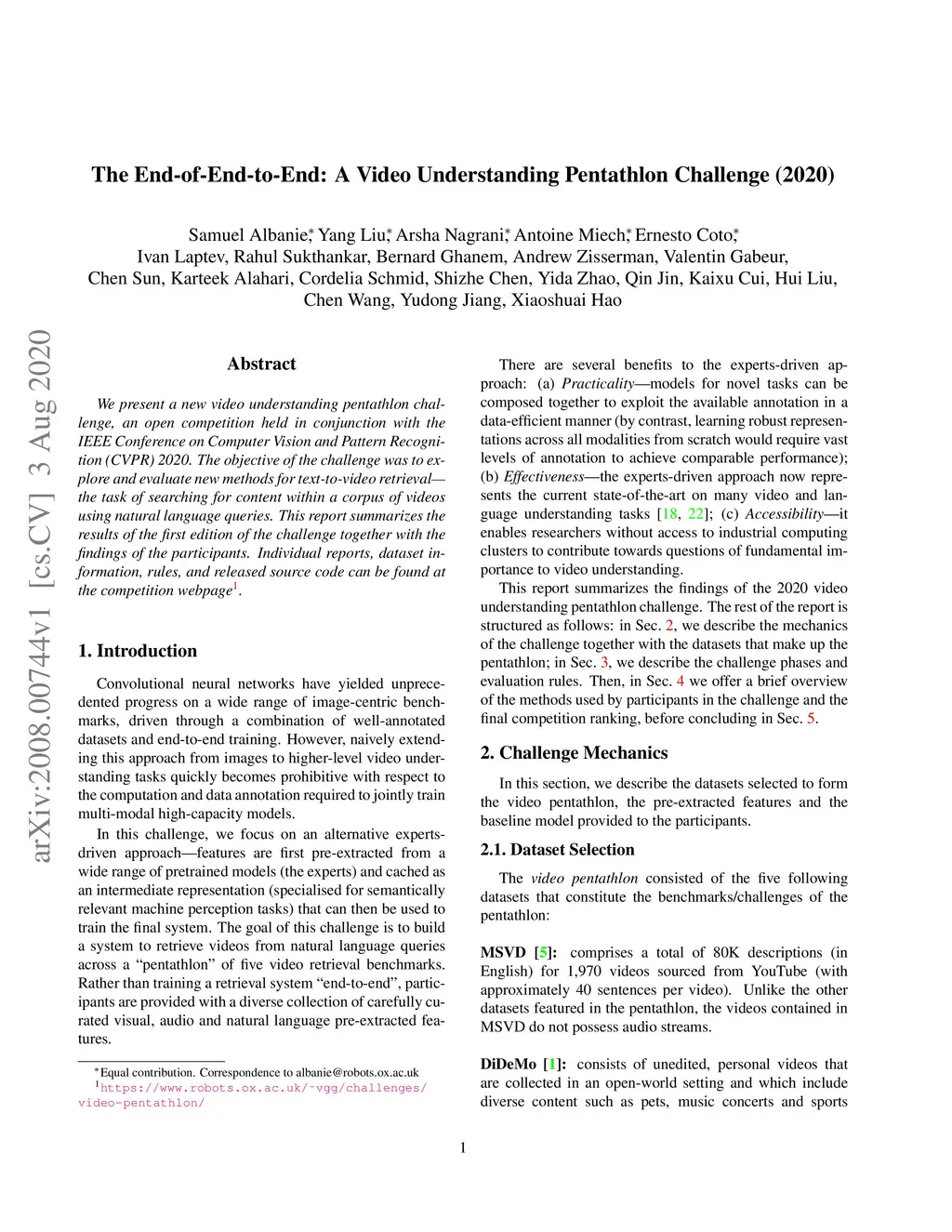 The End-of-End-to-End: A Video Understanding Pentathlon Challenge (2020)