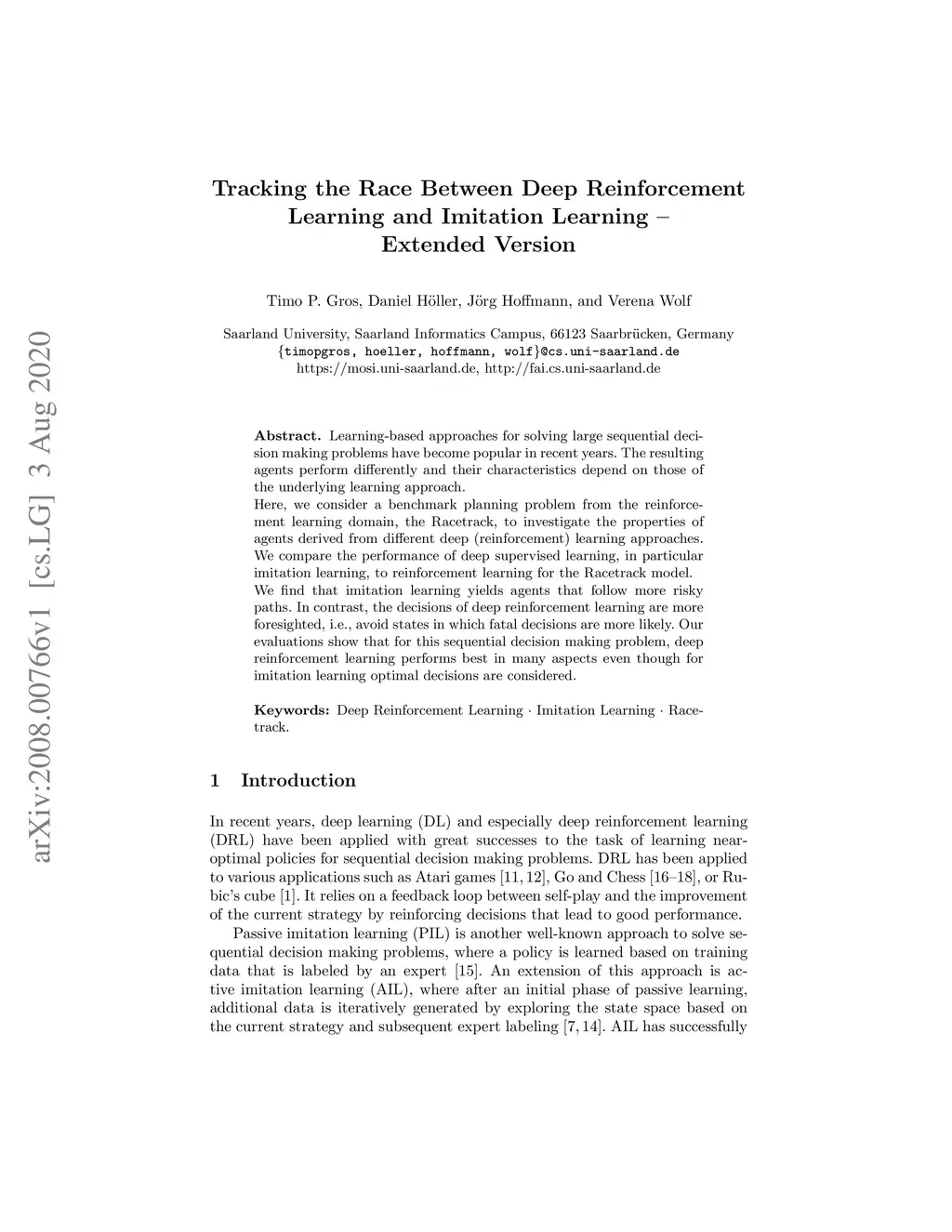 Learning-based approaches for solving large sequential decision making problems have become popular in recent years. The resulting agents perform differently and their characteristics depend on those of the underlying learning approach. Here, we consider a benchmark planning problem from the reinforcement learning domain, the Racetrack, to investigate the properties of agents derived from different deep (reinforcement) learning approaches. We compare the performance of deep supervised learning, in particular imitation learning, to reinforcement learning for the Racetrack model. We find that imitation learning yields agents that follow more risky paths. In contrast, the decisions of deep reinforcement learning are more foresighted, i.e., avoid states in which fatal decisions are more likely. Our evaluations show that for this sequential decision making problem, deep reinforcement learning performs best in many aspects even though for imitation learning optimal decisions are considered.