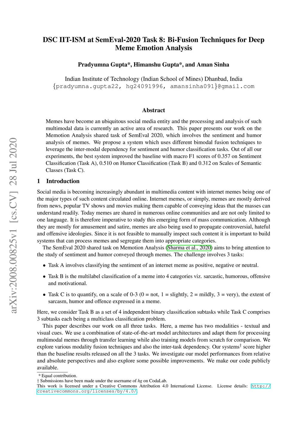 DSC IIT-ISM at SemEval-2020 Task 8: Bi-Fusion Techniques for Deep Meme