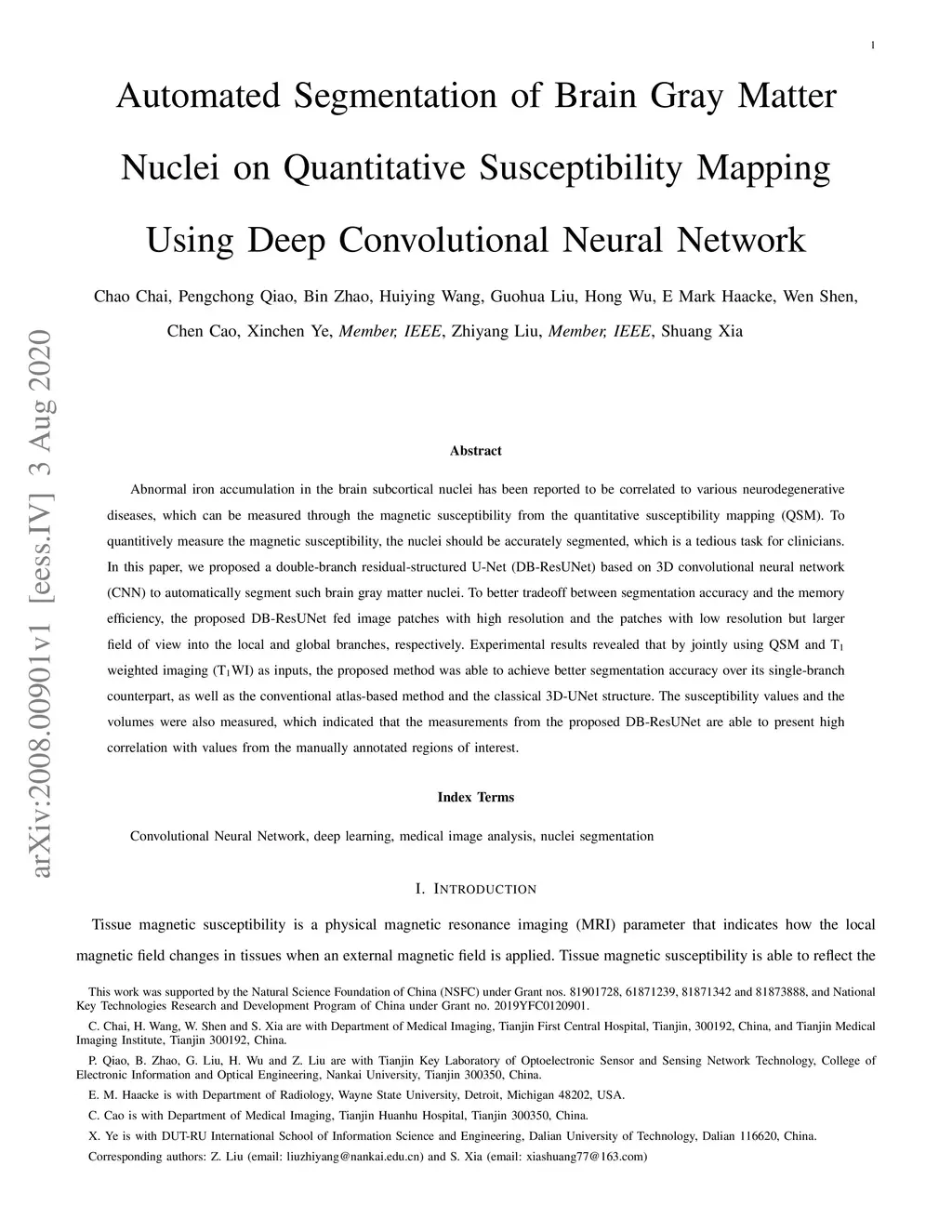 Abnormal iron accumulation in the brain subcortical nuclei has been reported to be correlated to various neurodegenerative diseases, which can be measured through the magnetic susceptibility from the quantitative susceptibility mapping (QSM). To quantitively measure the magnetic susceptibility, the nuclei should be accurately segmented, which is a tedious task for clinicians. In this paper, we proposed a double-branch residual-structured U-Net (DB-ResUNet) based on 3D convolutional neural network (CNN) to automatically segment such brain gray matter nuclei. To better tradeoff between segmentation accuracy and the memory efficiency, the proposed DB-ResUNet fed image patches with high resolution and the patches with low resolution but larger field of view into the local and global branches, respectively. Experimental results revealed that by jointly using QSM and T weighted imaging (TWI) as inputs, the proposed method was able to achieve better segmentation accuracy over its single-branch counterpart, as well as the conventional atlas-based method and the classical 3D-UNet structure. The susceptibility values and the volumes were also measured, which indicated that the measurements from the proposed DB-ResUNet are able to present high correlation with values from the manually annotated regions of interest.