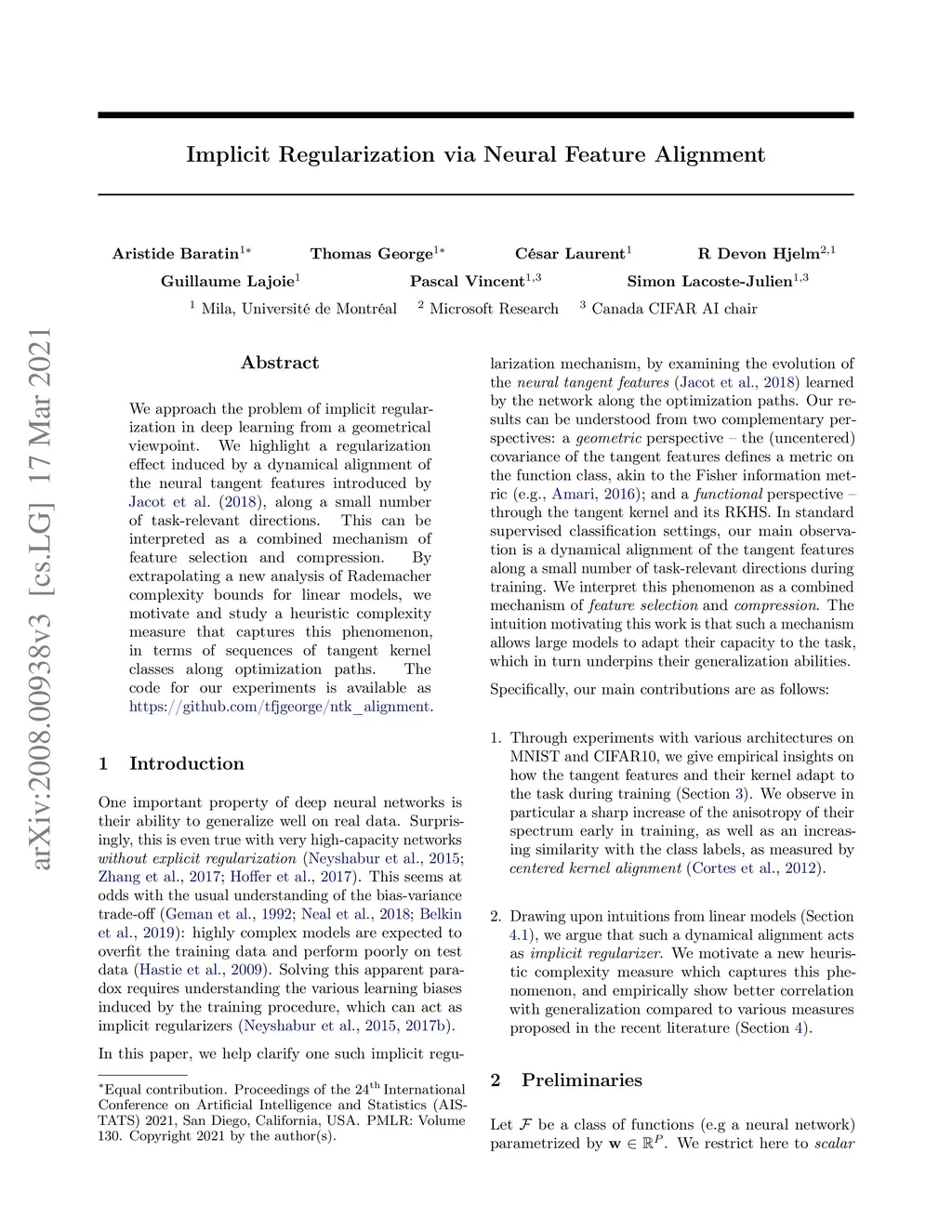 We approach the problem of implicit regularization in deep learning from a geometrical viewpoint. We highlight a regularization effect induced by a dynamical alignment of the neural tangent features introduced by Jacot et al, along a small number of task-relevant directions. This can be interpreted as a combined mechanism of feature selection and compression. By extrapolating a new analysis of Rademacher complexity bounds for linear models, we motivate and study a heuristic complexity measure that captures this phenomenon, in terms of sequences of tangent kernel classes along optimization paths.