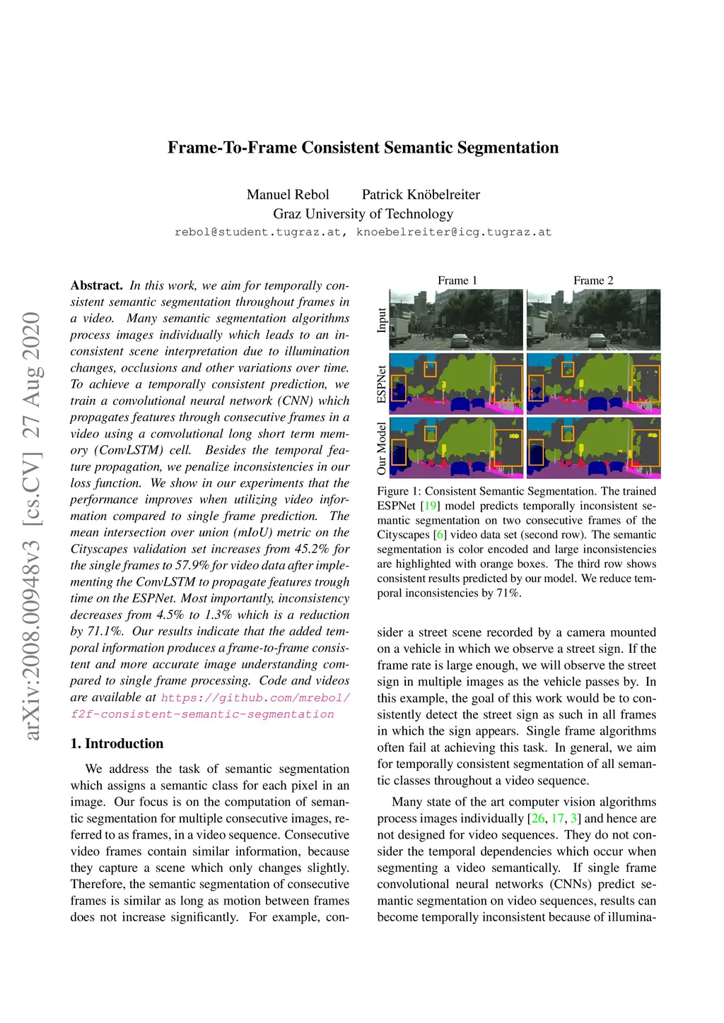 In this work, we aim for temporally consistent semantic segmentation throughout frames in a video. Many semantic segmentation algorithms process images individually which leads to an inconsistent scene interpretation due to illumination changes, occlusions and other variations over time. To achieve a temporally consistent prediction, we train a convolutional neural network (CNN) which propagates features through consecutive frames in a video using a convolutional long short term memory (ConvLSTM) cell. Besides the temporal feature propagation, we penalize inconsistencies in our loss function. We show in our experiments that the performance improves when utilizing video information compared to single frame prediction. The mean intersection over union (mIoU) metric on the Cityscapes validation set increases from 45.2 % for the single frames to 57.9 % for video data after implementing the ConvLSTM to propagate features trough time on the ESPNet. Most importantly, inconsistency decreases from 4.5 % to 1.3 % which is a reduction by 71.1 %. Our results indicate that the added temporal information produces a frame-to-frame consistent and more accurate image understanding compared to single frame processing. Code and videos are available at https://github.com/mrebol/f2f-consistent-semantic-segmentation