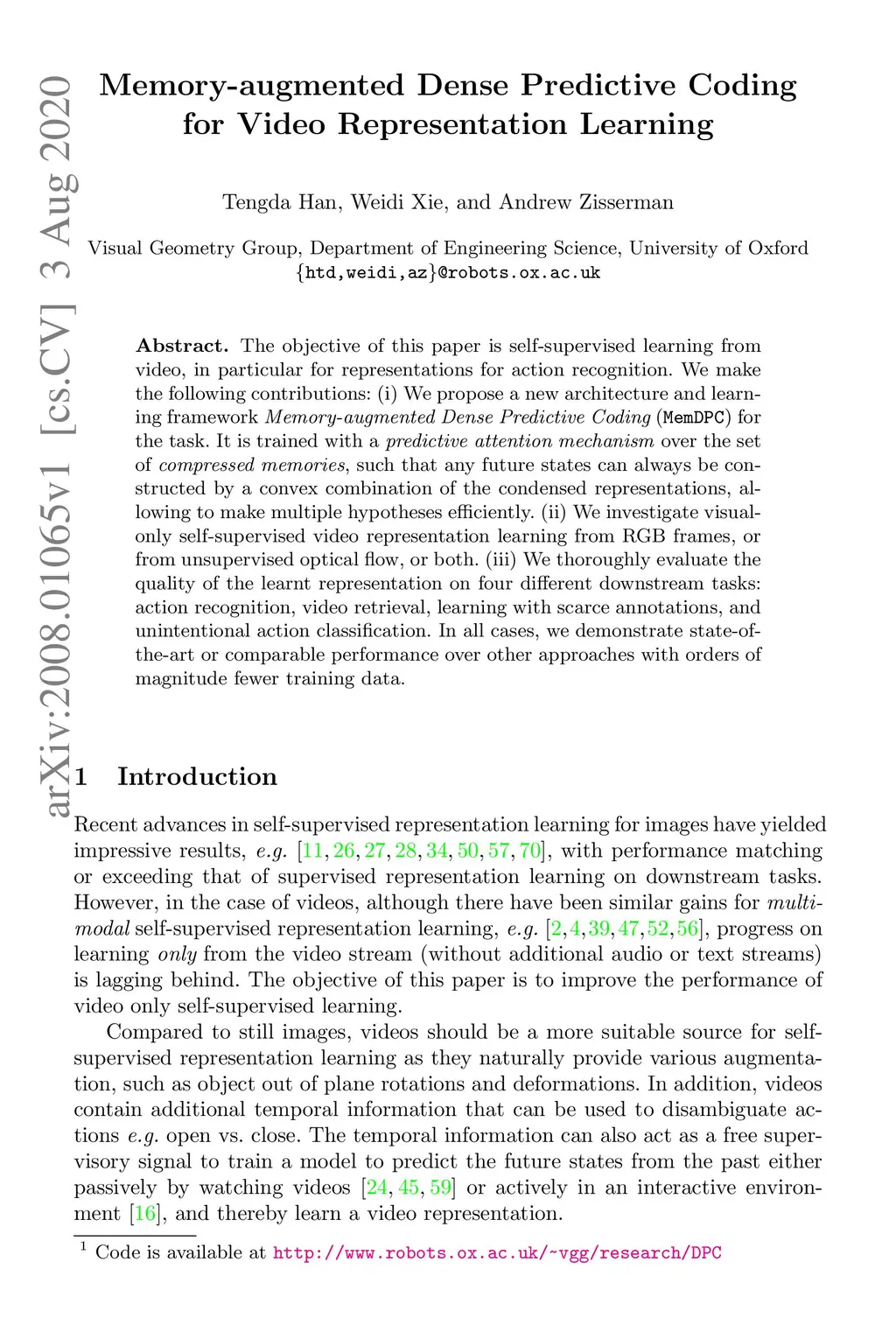 Memory-augmented Dense Predictive Coding for Video Representation