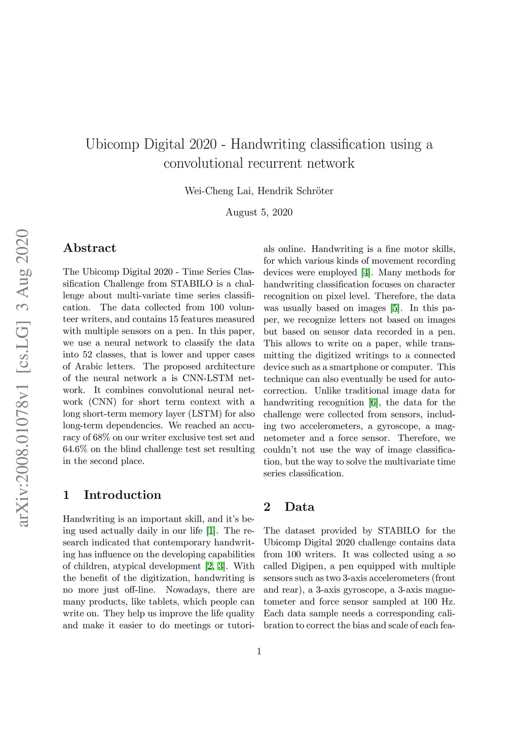 The Ubicomp Digital 2020 -- Time Series Classification Challenge from STABILO is a challenge about multi-variate time series classification. The data collected from 100 volunteer writers, and contains 15 features measured with multiple sensors on a pen. In this paper,we use a neural network to classify the data into 52 classes, that is lower and upper cases of Arabic letters. The proposed architecture of the neural network a is CNN-LSTM network. It combines convolutional neural network (CNN) for short term context with along short term memory layer (LSTM) for also long term dependencies. We reached an accuracy of 68% on our writer exclusive test set and64.6% on the blind challenge test set resulting in the second place.