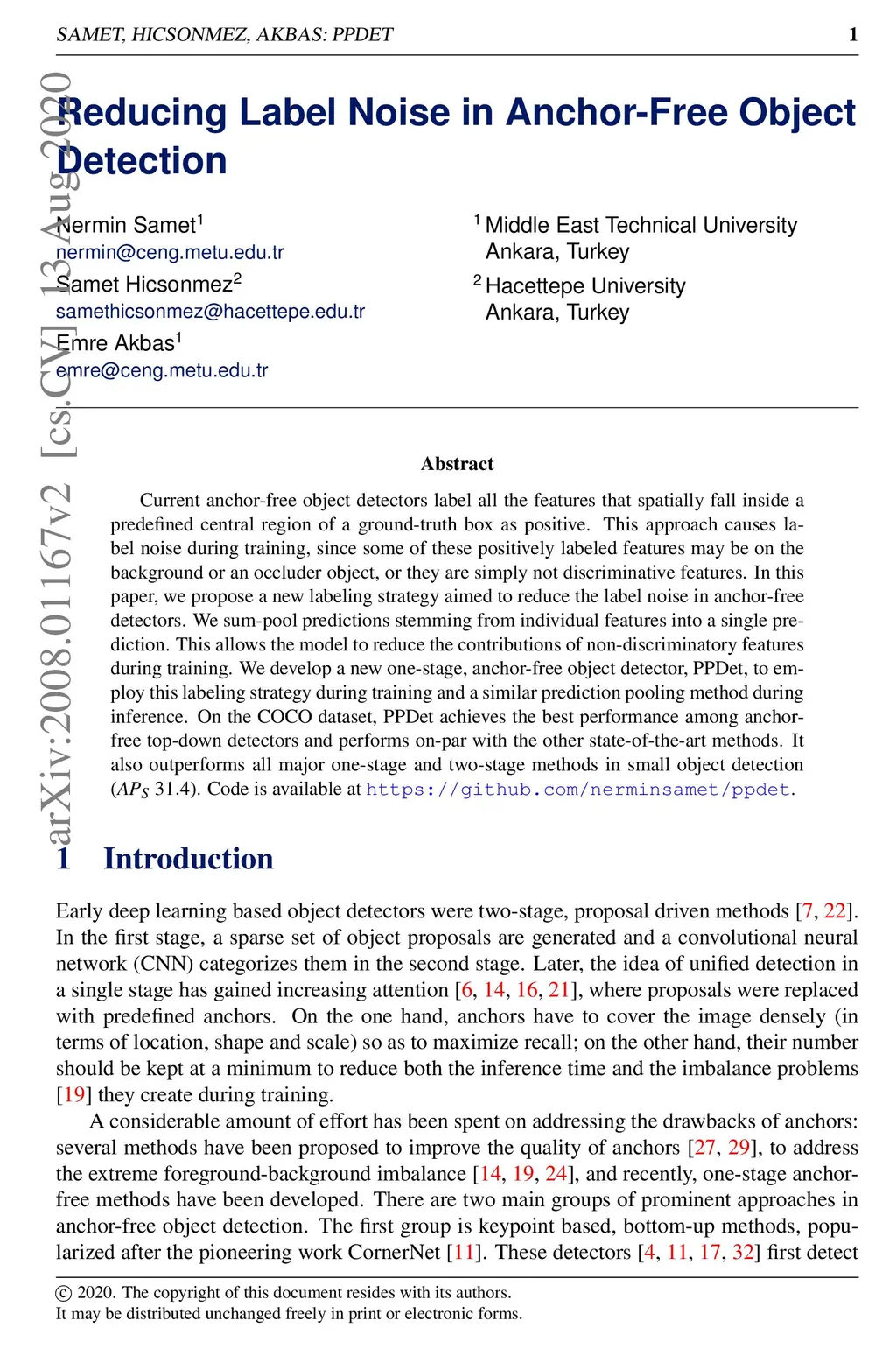 Current anchor-free object detectors label all the features that spatially fall inside a predefined central region of a ground-truth box as positive. This approach causes label noise during training, since some of these positively labeled features may be on the background or an occluder object, or they are simply not discriminative features. In this paper, we propose a new labeling strategy aimed to reduce the label noise in anchor-free detectors. We sum-pool predictions stemming from individual features into a single prediction. This allows the model to reduce the contributions of non-discriminatory features during training. We develop a new one-stage, anchor-free object detector, PPDet, to employ this labeling strategy during training and a similar prediction pooling method during inference. On the COCO dataset, PPDet achieves the best performance among anchor-free top-down detectors and performs on-par with the other state-of-the-art methods. It also outperforms all major one-stage and two-stage methods in small object detection ( ). Code is available at https://github.com/nerminsamet/ppdet
