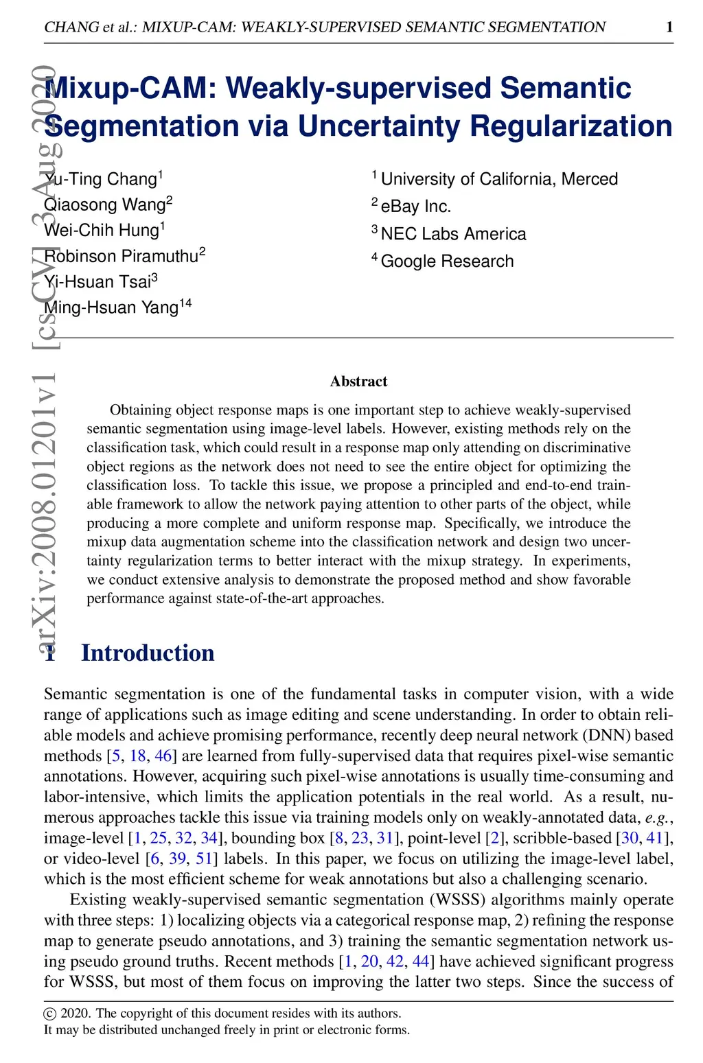 Obtaining object response maps is one important step to achieve weakly-supervised semantic segmentation using image-level labels. However, existing methods rely on the classification task, which could result in a response map only attending on discriminative object regions as the network does not need to see the entire object for optimizing the classification loss. To tackle this issue, we propose a principled and end-to-end train-able framework to allow the network to pay attention to other parts of the object, while producing a more complete and uniform response map. Specifically, we introduce the mixup data augmentation scheme into the classification network and design two uncertainty regularization terms to better interact with the mixup strategy. In experiments, we conduct extensive analysis to demonstrate the proposed method and show favorable performance against state-of-the-art approaches.