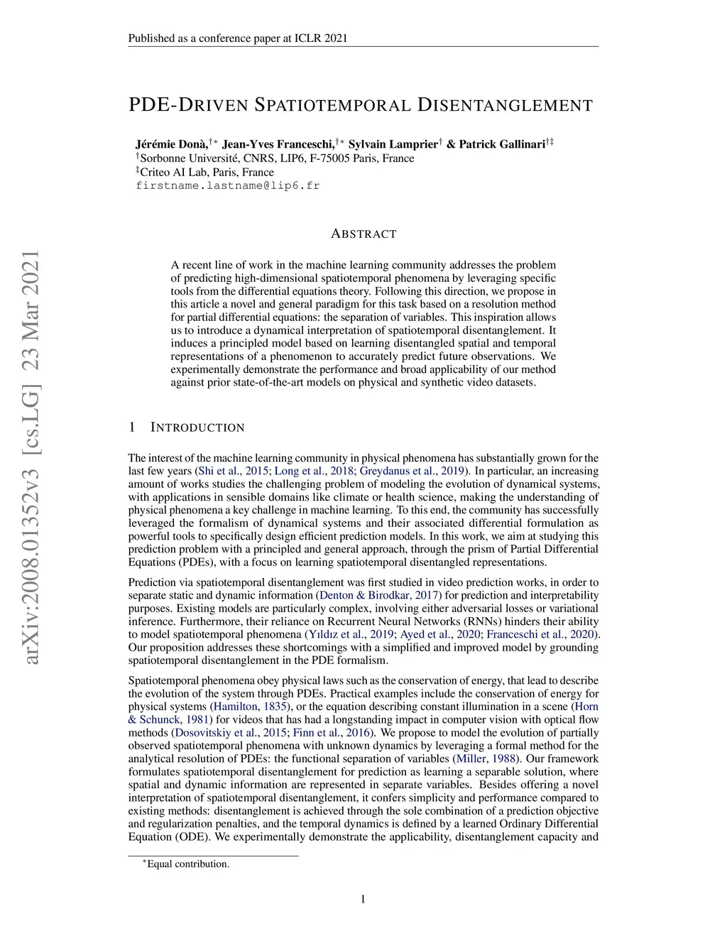 A recent line of work in the machine learning community addresses the problem of predicting high-dimensional spatiotemporal phenomena by leveraging specific tools from the differential equations theory. Following this direction, we propose in this article a novel and general paradigm for this task based on a resolution method for partial differential equations: the separation of variables. This inspiration allows us to introduce a dynamical interpretation of spatiotemporal disentanglement. It induces a principled model based on learning disentangled spatial and temporal representations of a phenomenon to accurately predict future observations. We experimentally demonstrate the performance and broad applicability of our method against prior state-of-the-art models on physical and synthetic video datasets.