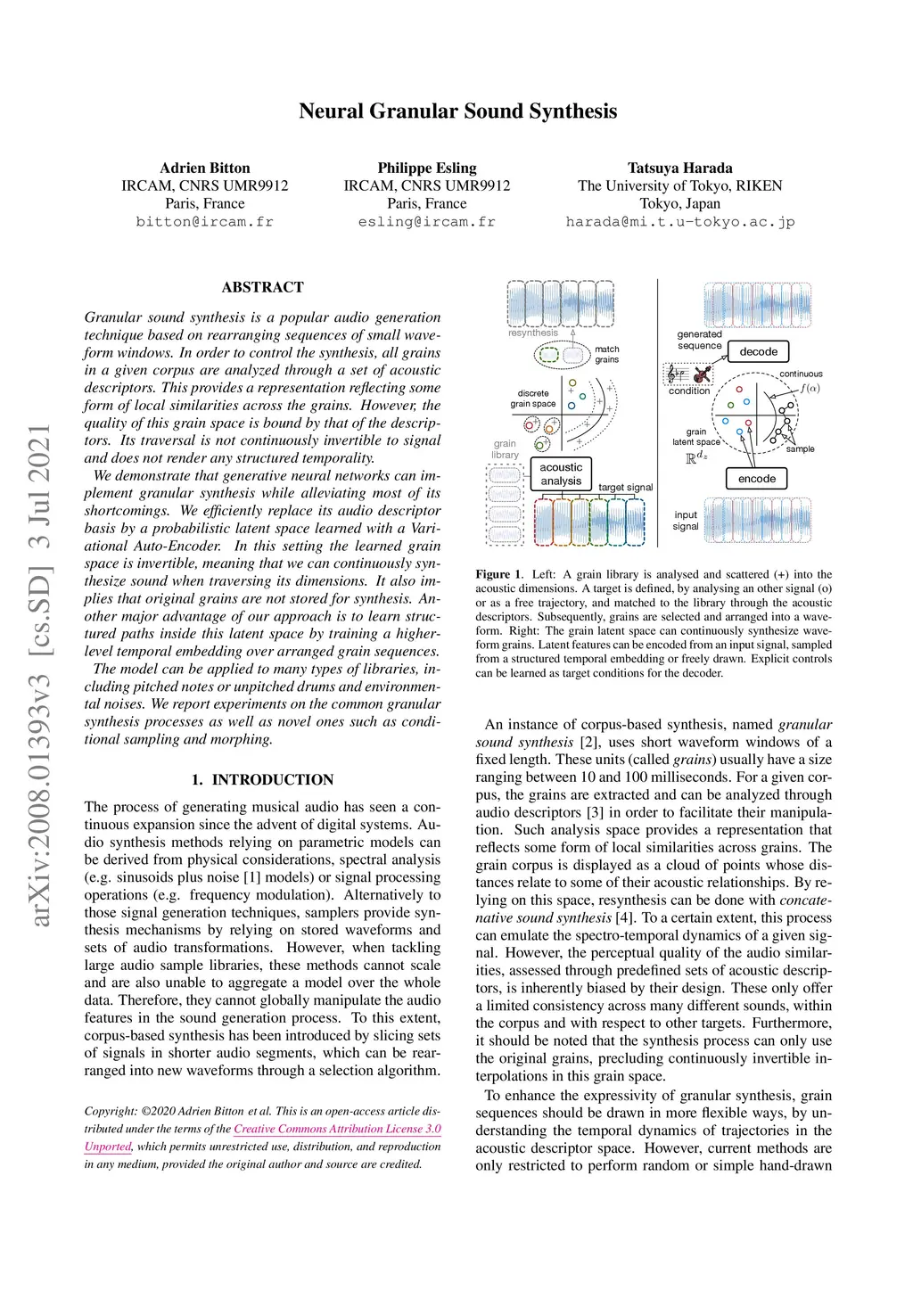 Granular sound synthesis is a popular audio generation technique based on rearranging sequences of small waveform windows. In order to control the synthesis, all grains in a given corpus are analyzed through a set of acoustic descriptors. This provides a representation reflecting some form of local similarities across the grains. However, the quality of this grain space is bound by that of the descriptors. Its traversal is not continuously invertible to signal and does not render any structured temporality. We demonstrate that generative neural networks can implement granular synthesis while alleviating most of its shortcomings. We efficiently replace its audio descriptor basis by a probabilistic latent space learned with a Variational Auto-Encoder. In this setting the learned grain space is invertible, meaning that we can continuously synthesize sound when traversing its dimensions. It also implies that original grains are not stored for synthesis. Another major advantage of our approach is to learn structured paths inside this latent space by training a higher-level temporal embedding over arranged grain sequences. The model can be applied to many types of libraries, including pitched notes or unpitched drums and environmental noises. We report experiments on the common granular synthesis processes as well as novel ones such as conditional sampling and morphing.