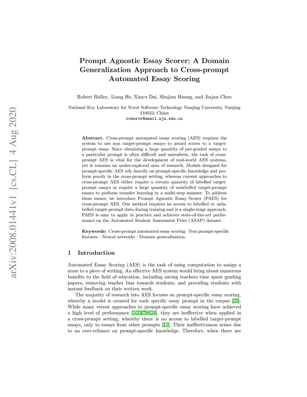 Prompt Agnostic Essay Scorer: A Domain Generalization Approach to