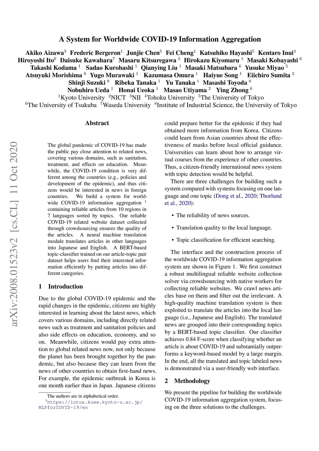 The global pandemic of COVID-19 has made the public pay close attention to related news, covering various domains, such as sanitation, treatment, and effects on education. Meanwhile, the COVID-19 condition is very different among the countries (e.g., policies and development of the epidemic), and thus citizens would be interested in news in foreign countries. We build a system for worldwide COVID-19 information aggregation containing reliable articles from 10 regions in 7 languages sorted by topics. Our reliable COVID-19 related website dataset collected through crowdsourcing ensures the quality of the articles. A neural machine translation module translates articles in other languages into Japanese and English. A BERT-based topic-classifier trained on our article-topic pair dataset helps users find their interested information efficiently by putting articles into different categories.