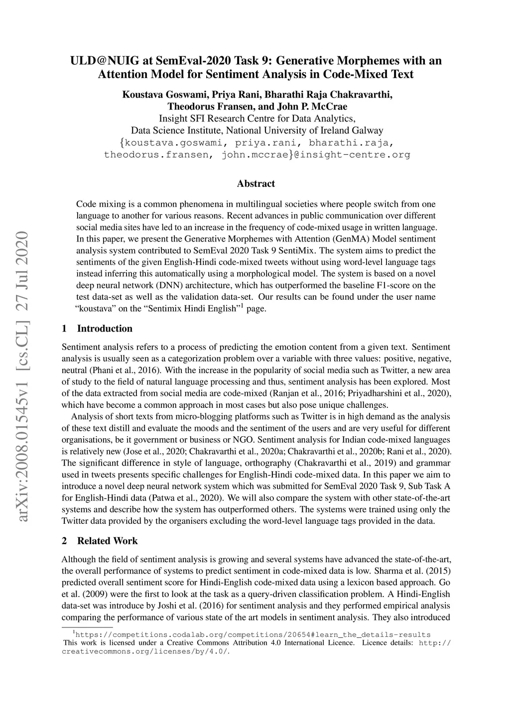 ULD@NUIG at SemEval-2020 Task 9: Generative Morphemes with an Attention