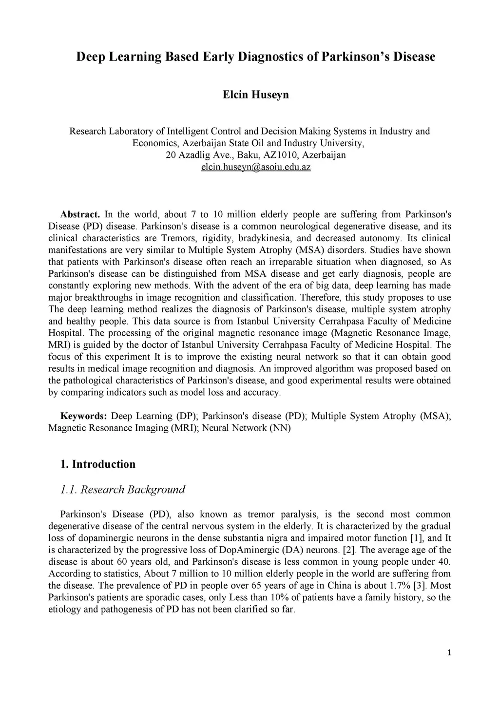 Deep Learning Based Early Diagnostics of Parkinsons Disease