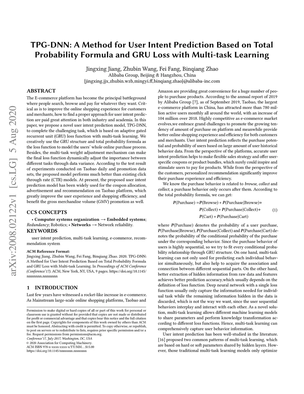 The E-commerce platform has become the principal battleground where people search, browse and pay for whatever they want. Critical as is to improve the online shopping experience for customers and merchants, how to find a proper approach for user intent prediction are paid great attention in both industry and academia. In this paper, we propose a novel user intent prediction model, TPG-DNN, to complete the challenging task, which is based on adaptive gated recurrent unit (GRU) loss function with multi-task learning. We creatively use the GRU structure and total probability formula as the loss function to model the users' whole online purchase process. Besides, the multi-task weight adjustment mechanism can make the final loss function dynamically adjust the importance between different tasks through data variance. According to the test result of experiments conducted on Taobao daily and promotion data sets, the proposed model performs much better than existing click through rate (CTR) models. At present, the proposed user intent prediction model has been widely used for the coupon allocation, advertisement and recommendation on Taobao platform, which greatly improve the user experience and shopping efficiency, and benefit the gross merchandise volume (GMV) promotion as well.