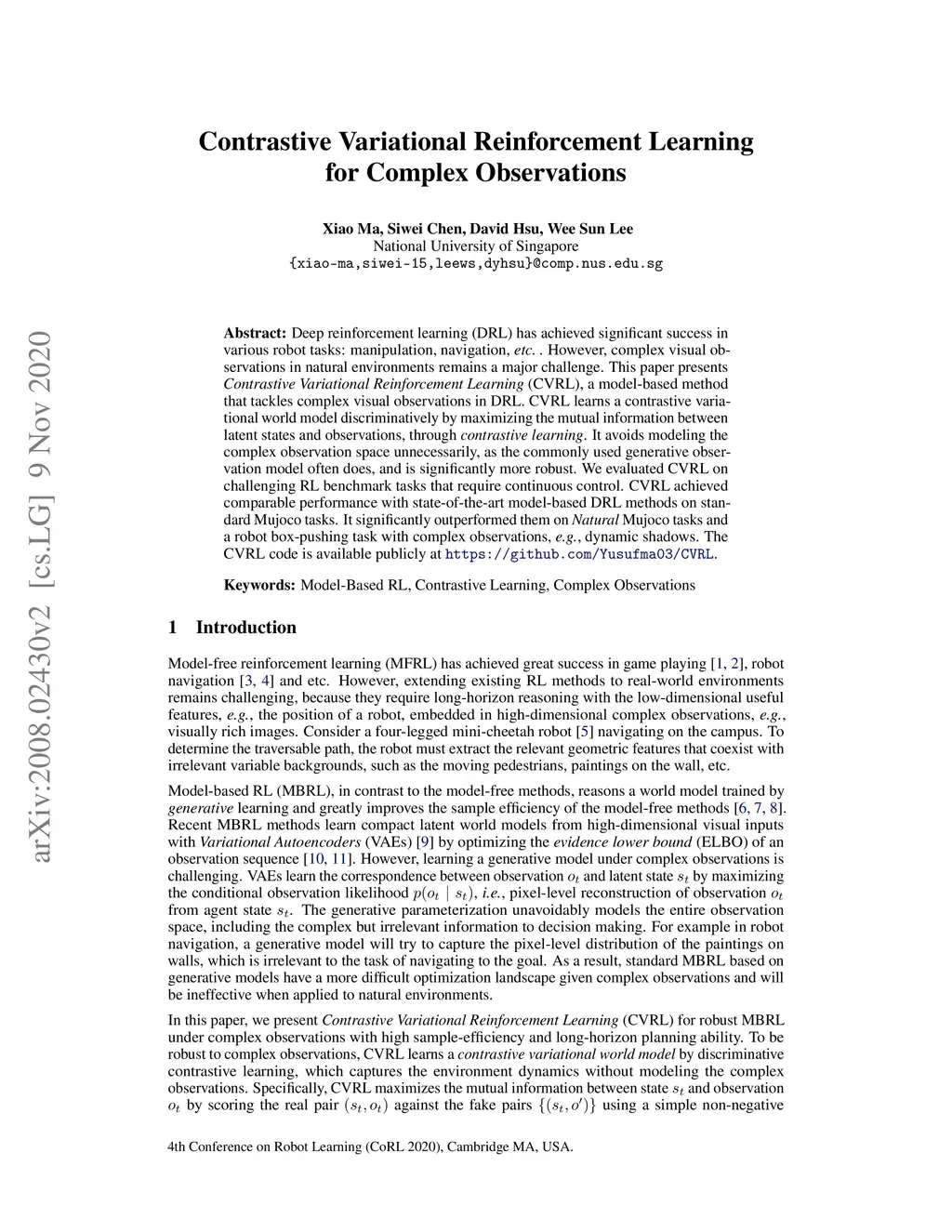 Contrastive Variational Reinforcement Learning for Complex Observations