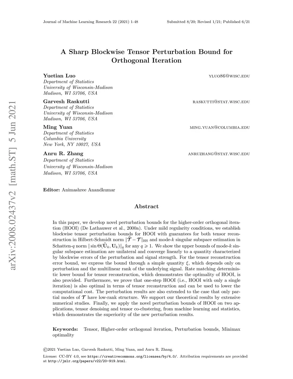 In this paper, we develop novel perturbation bounds for the high-order orthogonal iteration (HOOI) [DLDMV00b]. Under mild regularity conditions, we establish blockwise tensor perturbation bounds for HOOI with guarantees for both tensor reconstruction in Hilbert-Schmidt norm and mode- singular subspace estimation in Schatten- norm for any . We show the upper bounds of mode- singular subspace estimation are unilateral and converge linearly to a quantity characterized by blockwise errors of the perturbation and signal strength. For the tensor reconstruction error bound, we express the bound through a simple quantity , which depends only on perturbation and the multilinear rank of the underlying signal. Rate matching deterministic lower bound for tensor reconstruction, which demonstrates the optimality of HOOI, is also provided. Furthermore, we prove that one-step HOOI (i.e., HOOI with only a single iteration) is also optimal in terms of tensor reconstruction and can be used to lower the computational cost. The perturbation results are also extended to the case that only partial modes of have low-rank structure. We support our theoretical results by extensive numerical studies. Finally, we apply the novel perturbation bounds of HOOI on two applications, tensor denoising and tensor co-clustering, from machine learning and statistics, which demonstrates the superiority of the new perturbation results.