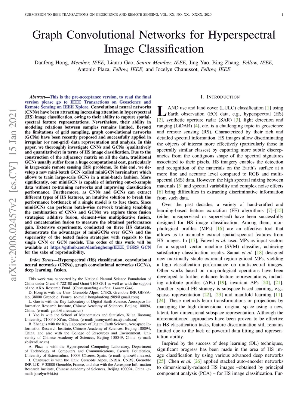 To read the final version please go to IEEE TGRS on IEEE Xplore. Convolutional neural networks (CNNs) have been attracting increasing attention in hyperspectral (HS) image classification, owing to their ability to capture spatial-spectral feature representations. Nevertheless, their ability in modeling relations between samples remains limited. Beyond the limitations of grid sampling, graph convolutional networks (GCNs) have been recently proposed and successfully applied in irregular (or non-grid) data representation and analysis. In this paper, we thoroughly investigate CNNs and GCNs (qualitatively and quantitatively) in terms of HS image classification. Due to the construction of the adjacency matrix on all the data, traditional GCNs usually suffer from a huge computational cost, particularly in large-scale remote sensing (RS) problems. To this end, we develop a new mini-batch GCN (called miniGCN hereinafter) which allows to train large-scale GCNs in a mini-batch fashion. More significantly, our miniGCN is capable of inferring out-of-sample data without re-training networks and improving classification performance. Furthermore, as CNNs and GCNs can extract different types of HS features, an intuitive solution to break the performance bottleneck of a single model is to fuse them. Since miniGCNs can perform batch-wise network training (enabling the combination of CNNs and GCNs) we explore three fusion strategies: additive fusion, element-wise multiplicative fusion, and concatenation fusion to measure the obtained performance gain. Extensive experiments, conducted on three HS datasets, demonstrate the advantages of miniGCNs over GCNs and the superiority of the tested fusion strategies with regards to the single CNN or GCN models. The codes of this work will be available at https://github.com/danfenghong/IEEE_TGRS_GCN for the sake of reproducibility.