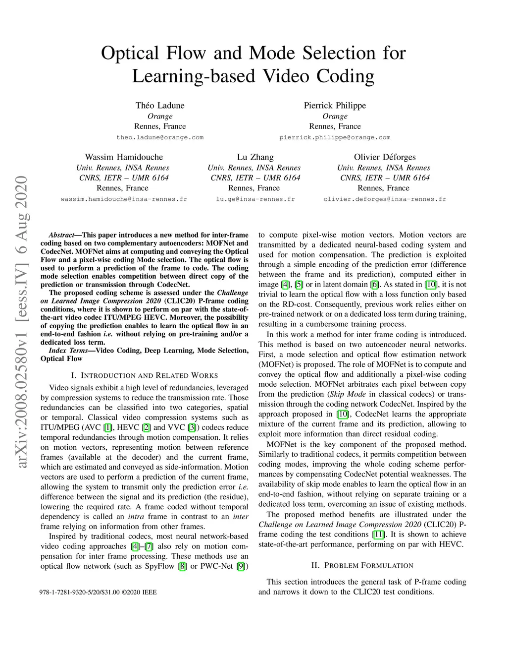 This paper introduces a new method for inter-frame coding based on two complementary autoencoders: MOFNet and CodecNet. MOFNet aims at computing and conveying the Optical Flow and a pixel-wise coding Mode selection. The optical flow is used to perform a prediction of the frame to code. The coding mode selection enables competition between direct copy of the prediction or transmission through CodecNet. The proposed coding scheme is assessed under the Challenge on Learned Image Compression 2020 (CLIC20) P-frame coding conditions, where it is shown to perform on par with the state-of-the-art video codec ITU/MPEG HEVC. Moreover, the possibility of copying the prediction enables to learn the optical flow in an end-to-end fashion i.e. without relying on pre-training and/or a dedicated loss term.