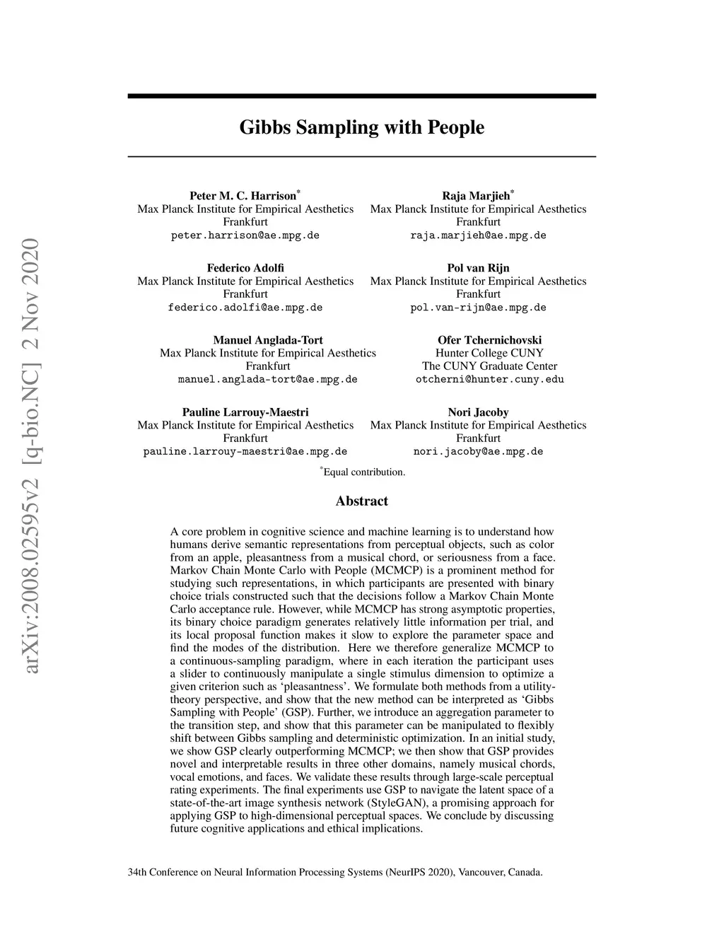 A core problem in cognitive science and machine learning is to understand how humans derive semantic representations from perceptual objects, such as color from an apple, pleasantness from a musical chord, or seriousness from a face. Markov Chain Monte Carlo with People (MCMCP) is a prominent method for studying such representations, in which participants are presented with binary choice trials constructed such that the decisions follow a Markov Chain Monte Carlo acceptance rule. However, while MCMCP has strong asymptotic properties, its binary choice paradigm generates relatively little information per trial, and its local proposal function makes it slow to explore the parameter space and find the modes of the distribution. Here we therefore generalize MCMCP to a continuous-sampling paradigm, where in each iteration the participant uses a slider to continuously manipulate a single stimulus dimension to optimize a given criterion such as 'pleasantness'. We formulate both methods from a utility-theory perspective, and show that the new method can be interpreted as 'Gibbs Sampling with People' (GSP). Further, we introduce an aggregation parameter to the transition step, and show that this parameter can be manipulated to flexibly shift between Gibbs sampling and deterministic optimization. In an initial study, we show GSP clearly outperforming MCMCP; we then show that GSP provides novel and interpretable results in three other domains, namely musical chords, vocal emotions, and faces. We validate these results through large-scale perceptual rating experiments. The final experiments use GSP to navigate the latent space of a state-of-the-art image synthesis network (StyleGAN), a promising approach for applying GSP to high-dimensional perceptual spaces. We conclude by discussing future cognitive applications and ethical implications.