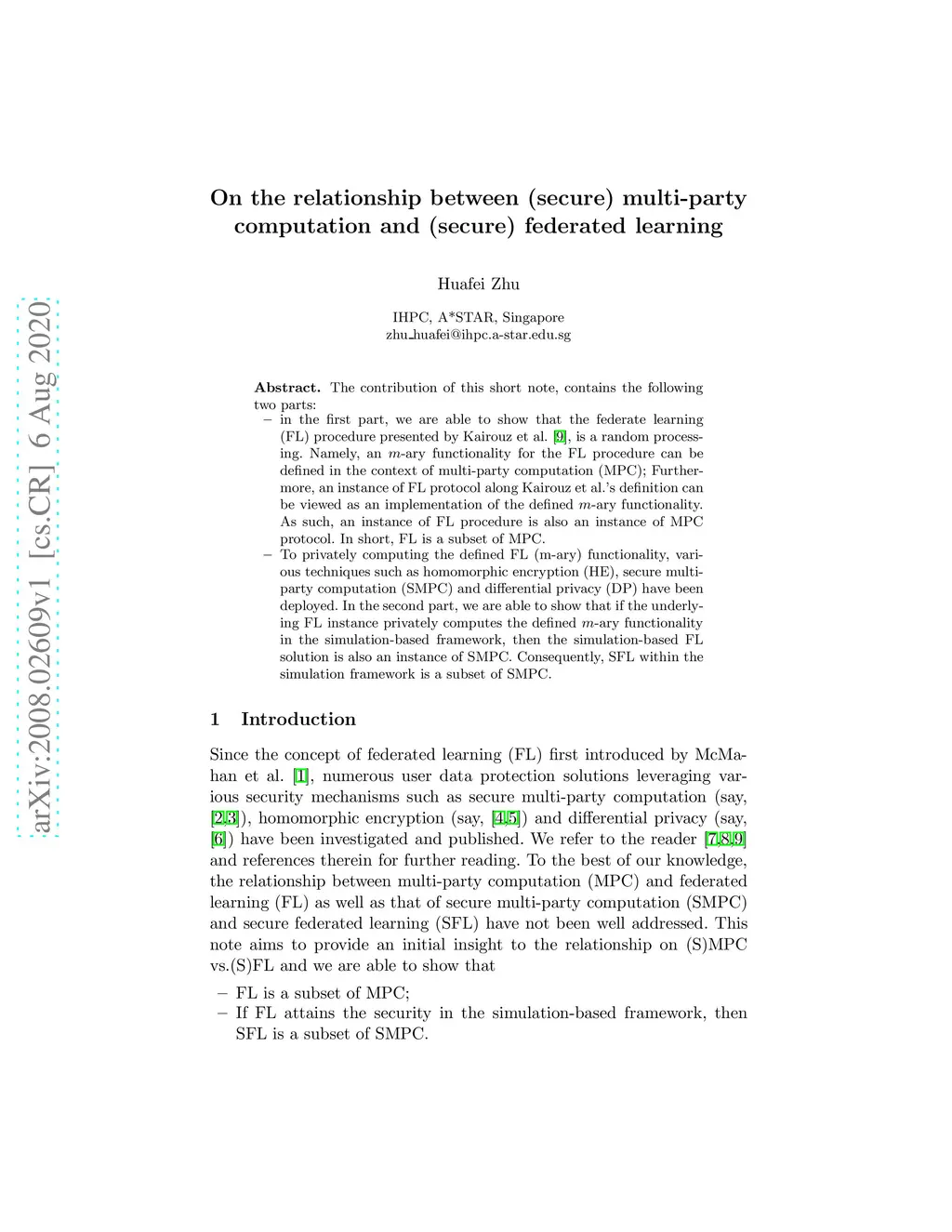 The contribution of this short note, contains the following two parts: in the first part, we are able to show that the federate learning (FL) procedure presented by Kairouz et al. \cite{Kairouz1901}, is a random processing. Namely, an -ary functionality for the FL procedure can be defined in the context of multi-party computation (MPC); Furthermore, an instance of FL protocol along Kairouz et al.'s definition can be viewed as an implementation of the defined -ary functionality. As such, an instance of FL procedure is also an instance of MPC protocol. In short, FL is a subset of MPC. To privately computing the defined FL (m-ary) functionality, various techniques such as homomorphic encryption (HE), secure multi-party computation (SMPC) and differential privacy (DP) have been deployed. In the second part, we are able to show that if the underlying FL instance privately computes the defined -ary functionality in the simulation-based framework, then the simulation-based FL solution is also an instance of SMPC. Consequently, SFL is a subset of SMPC.