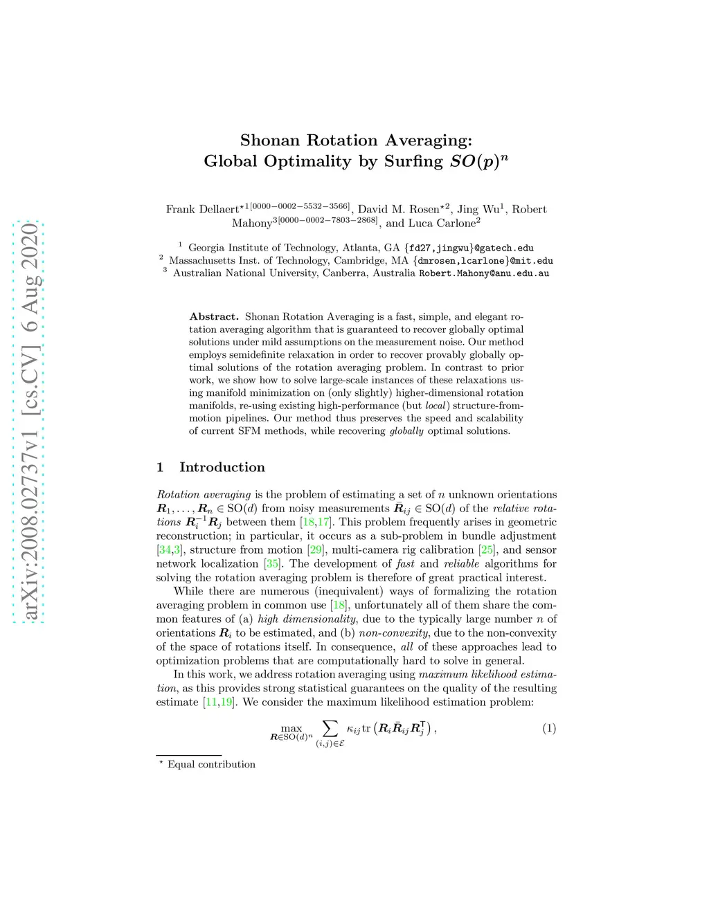 Shonan Rotation Averaging is a fast, simple, and elegant rotation averaging algorithm that is guaranteed to recover globally optimal solutions under mild assumptions on the measurement noise. Our method employs semidefinite relaxation in order to recover provably globally optimal solutions of the rotation averaging problem. In contrast to prior work, we show how to solve large-scale instances of these relaxations using manifold minimization on (only slightly) higher-dimensional rotation manifolds, re-using existing high-performance (but local) structure-from-motion pipelines. Our method thus preserves the speed and scalability of current SFM methods, while recovering globally optimal solutions.
