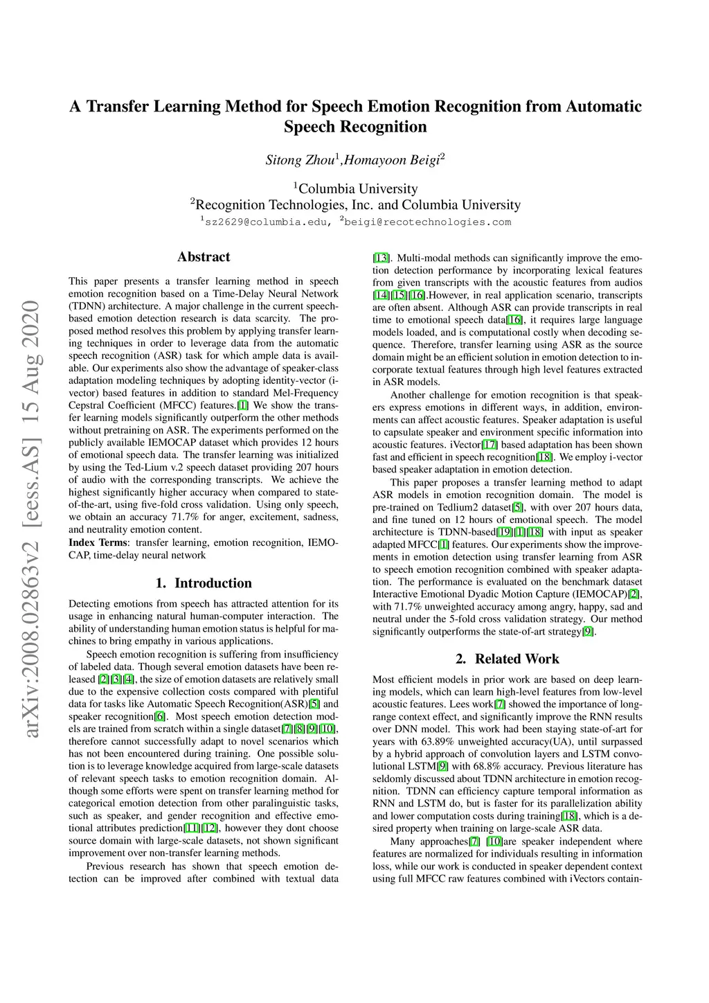 This paper presents a transfer learning method in speech emotion recognition based on a Time-Delay Neural Network (TDNN) architecture. A major challenge in the current speech-based emotion detection research is data scarcity. The proposed method resolves this problem by applying transfer learning techniques in order to leverage data from the automatic speech recognition (ASR) task for which ample data is available. Our experiments also show the advantage of speaker-class adaptation modeling techniques by adopting identity-vector (i-vector) based features in addition to standard Mel-Frequency Cepstral Coefficient (MFCC) features.[1] We show the transfer learning models significantly outperform the other methods without pretraining on ASR. The experiments performed on the publicly available IEMOCAP dataset which provides 12 hours of motional speech data. The transfer learning was initialized by using the Ted-Lium v.2 speech dataset providing 207 hours of audio with the corresponding transcripts. We achieve the highest significantly higher accuracy when compared to state-of-the-art, using five-fold cross validation. Using only speech, we obtain an accuracy 71.7% for anger, excitement, sadness, and neutrality emotion content.
