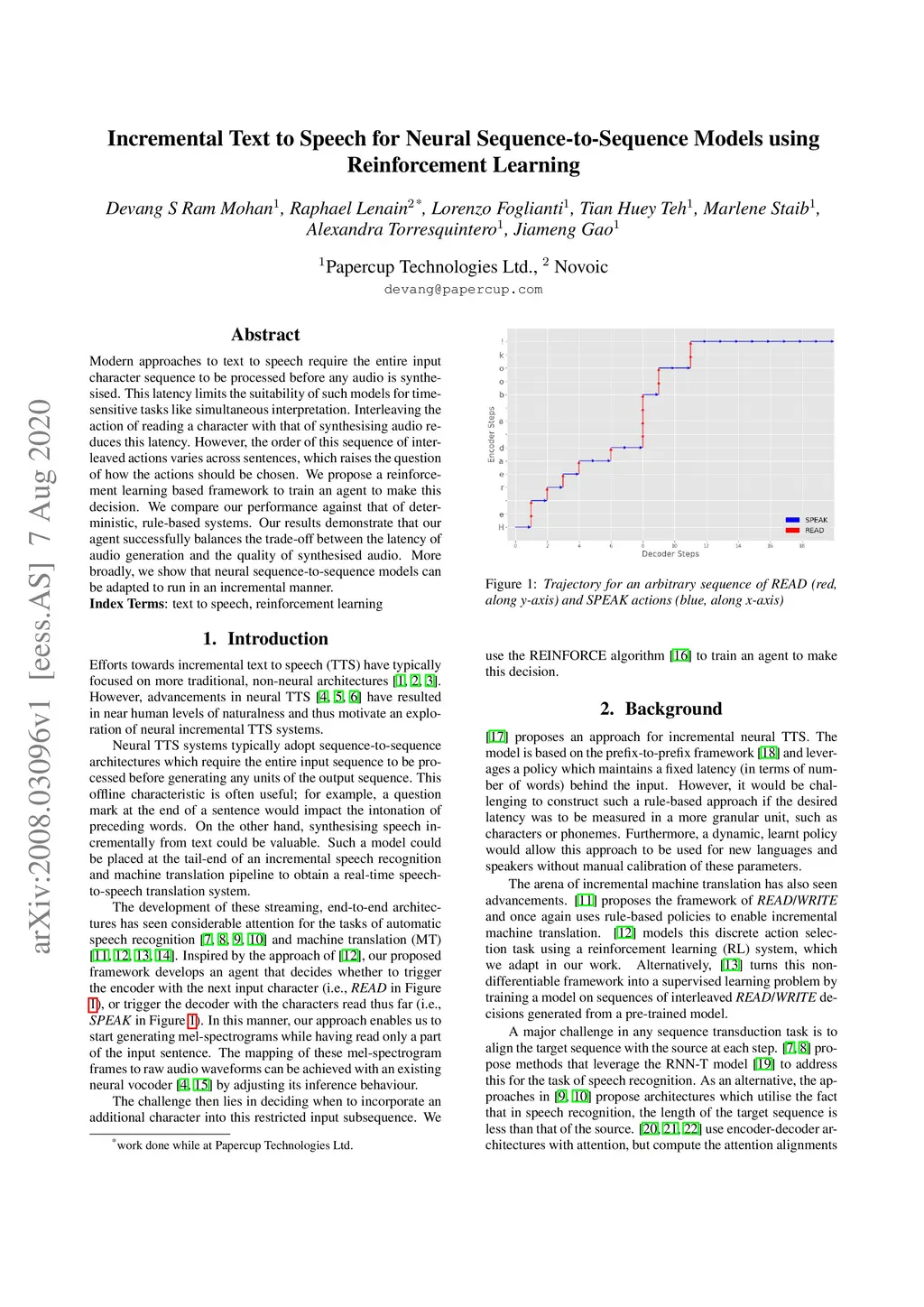 Modern approaches to text to speech require the entire input character sequence to be processed before any audio is synthesised. This latency limits the suitability of such models for time-sensitive tasks like simultaneous interpretation. Interleaving the action of reading a character with that of synthesising audio reduces this latency. However, the order of this sequence of interleaved actions varies across sentences, which raises the question of how the actions should be chosen. We propose a reinforcement learning based framework to train an agent to make this decision. We compare our performance against that of deterministic, rule-based systems. Our results demonstrate that our agent successfully balances the trade-off between the latency of audio generation and the quality of synthesised audio. More broadly, we show that neural sequence-to-sequence models can be adapted to run in an incremental manner.
