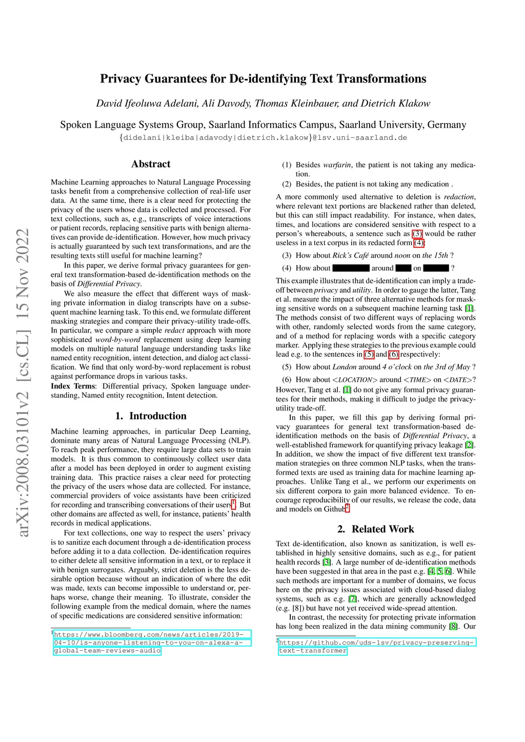 Machine Learning approaches to Natural Language Processing tasks benefit from a comprehensive collection of real-life user data. At the same time, there is a clear need for protecting the privacy of the users whose data is collected and processed. For text collections, such as, e.g., transcripts of voice interactions or patient records, replacing sensitive parts with benign alternatives can provide de-identification. However, how much privacy is actually guaranteed by such text transformations, and are the resulting texts still useful for machine learning? In this paper, we derive formal privacy guarantees for general text transformation-based de-identification methods on the basis of Differential Privacy. We also measure the effect that different ways of masking private information in dialog transcripts have on a subsequent machine learning task. To this end, we formulate different masking strategies and compare their privacy-utility trade-offs. In particular, we compare a simple redact approach with more sophisticated word-by-word replacement using deep learning models on multiple natural language understanding tasks like named entity recognition, intent detection, and dialog act classification. We find that only word-by-word replacement is robust against performance drops in various tasks.