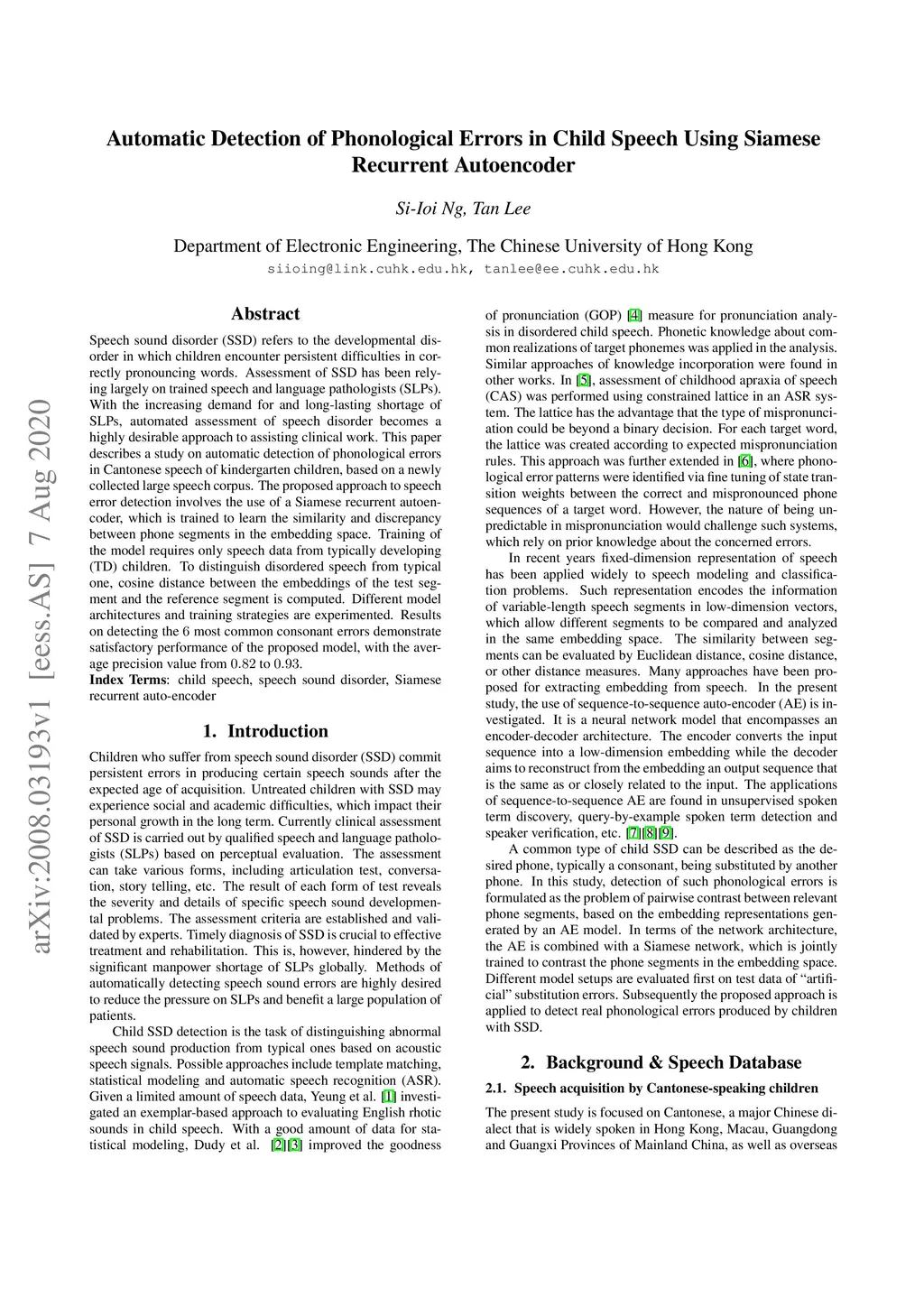 Speech sound disorder (SSD) refers to the developmental disorder in which children encounter persistent difficulties in correctly pronouncing words. Assessment of SSD has been relying largely on trained speech and language pathologists (SLPs). With the increasing demand for and long-lasting shortage of SLPs, automated assessment of speech disorder becomes a highly desirable approach to assisting clinical work. This paper describes a study on automatic detection of phonological errors in Cantonese speech of kindergarten children, based on a newly collected large speech corpus. The proposed approach to speech error detection involves the use of a Siamese recurrent autoencoder, which is trained to learn the similarity and discrepancy between phone segments in the embedding space. Training of the model requires only speech data from typically developing (TD) children. To distinguish disordered speech from typical one, cosine distance between the embeddings of the test segment and the reference segment is computed. Different model architectures and training strategies are experimented. Results on detecting the 6 most common consonant errors demonstrate satisfactory performance of the proposed model, with the average precision value from 0.82 to 0.93.
