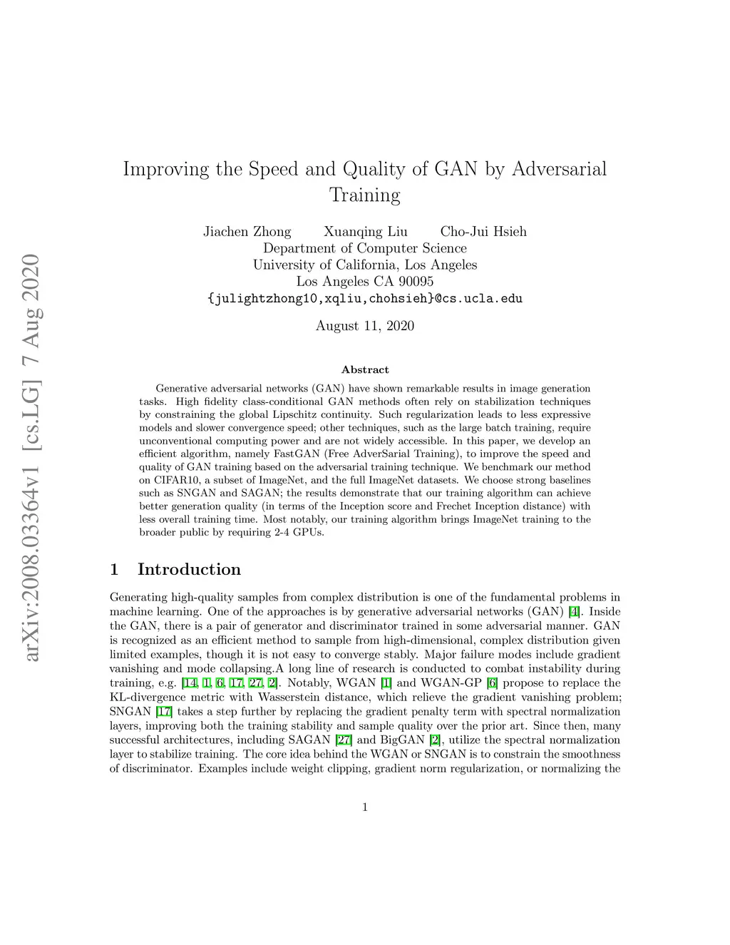 Improving the Speed and Quality of GAN by Adversarial Training