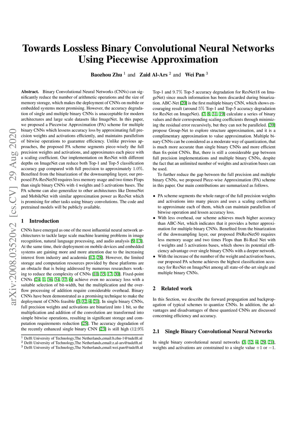 Towards Lossless Binary Convolutional Neural Networks Using Piecewise