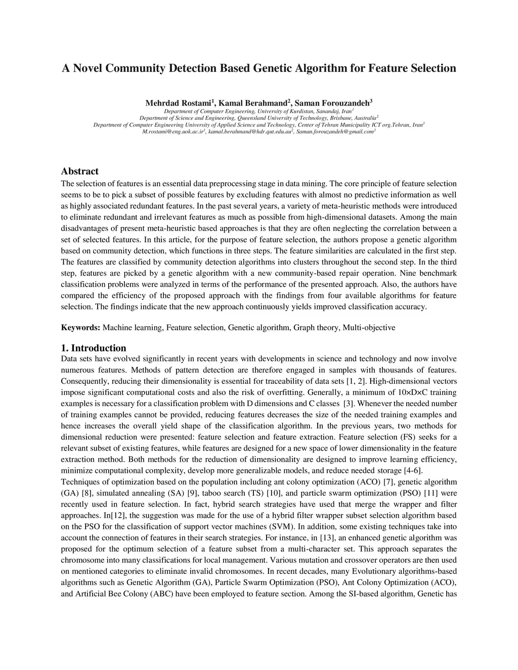 The selection of features is an essential data preprocessing stage in data mining. The core principle of feature selection seems to be to pick a subset of possible features by excluding features with almost no predictive information as well as highly associated redundant features. In the past several years, a variety of meta-heuristic methods were introduced to eliminate redundant and irrelevant features as much as possible from high-dimensional datasets. Among the main disadvantages of present meta-heuristic based approaches is that they are often neglecting the correlation between a set of selected features. In this article, for the purpose of feature selection, the authors propose a genetic algorithm based on community detection, which functions in three steps. The feature similarities are calculated in the first step. The features are classified by community detection algorithms into clusters throughout the second step. In the third step, features are picked by a genetic algorithm with a new community-based repair operation. Nine benchmark classification problems were analyzed in terms of the performance of the presented approach. Also, the authors have compared the efficiency of the proposed approach with the findings from four available algorithms for feature selection. The findings indicate that the new approach continuously yields improved classification accuracy.