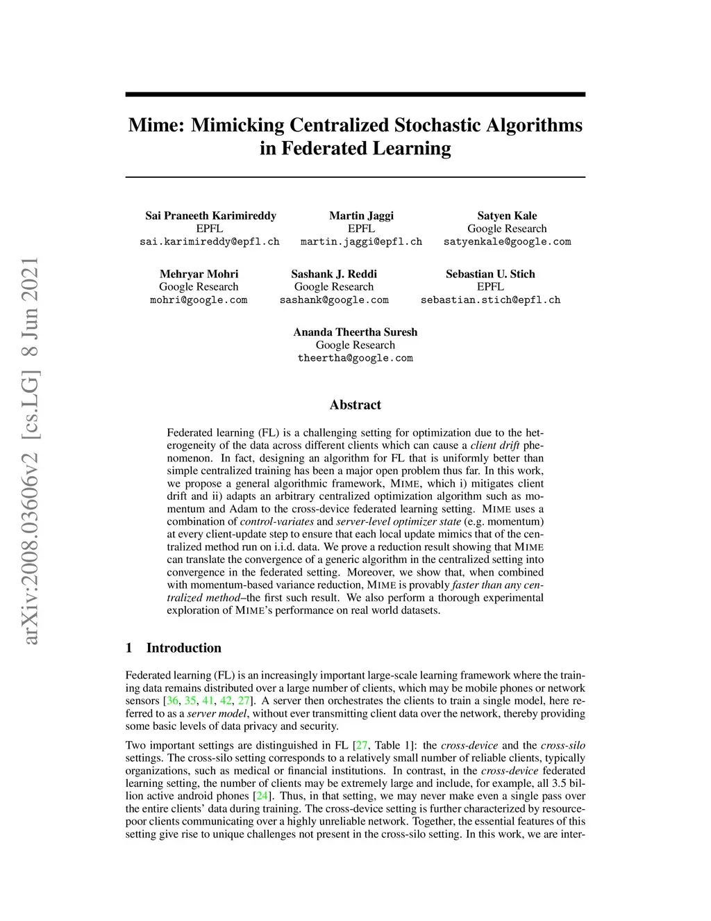 Federated learning (FL) is a challenging setting for optimization due to the heterogeneity of the data across different clients which gives rise to the client drift phenomenon. In fact, obtaining an algorithm for FL which is uniformly better than simple centralized training has been a major open problem thus far. In this work, we propose a general algorithmic framework, Mime, which i) mitigates client drift and ii) adapts arbitrary centralized optimization algorithms such as momentum and Adam to the cross-device federated learning setting. Mime uses a combination of control-variates and server-level statistics (e.g. momentum) at every client-update step to ensure that each local update mimics that of the centralized method run on iid data. We prove a reduction result showing that Mime can translate the convergence of a generic algorithm in the centralized setting into convergence in the federated setting. Further, we show that when combined with momentum based variance reduction, Mime is provably faster than any centralized method--the first such result. We also perform a thorough experimental exploration of Mime's performance on real world datasets.