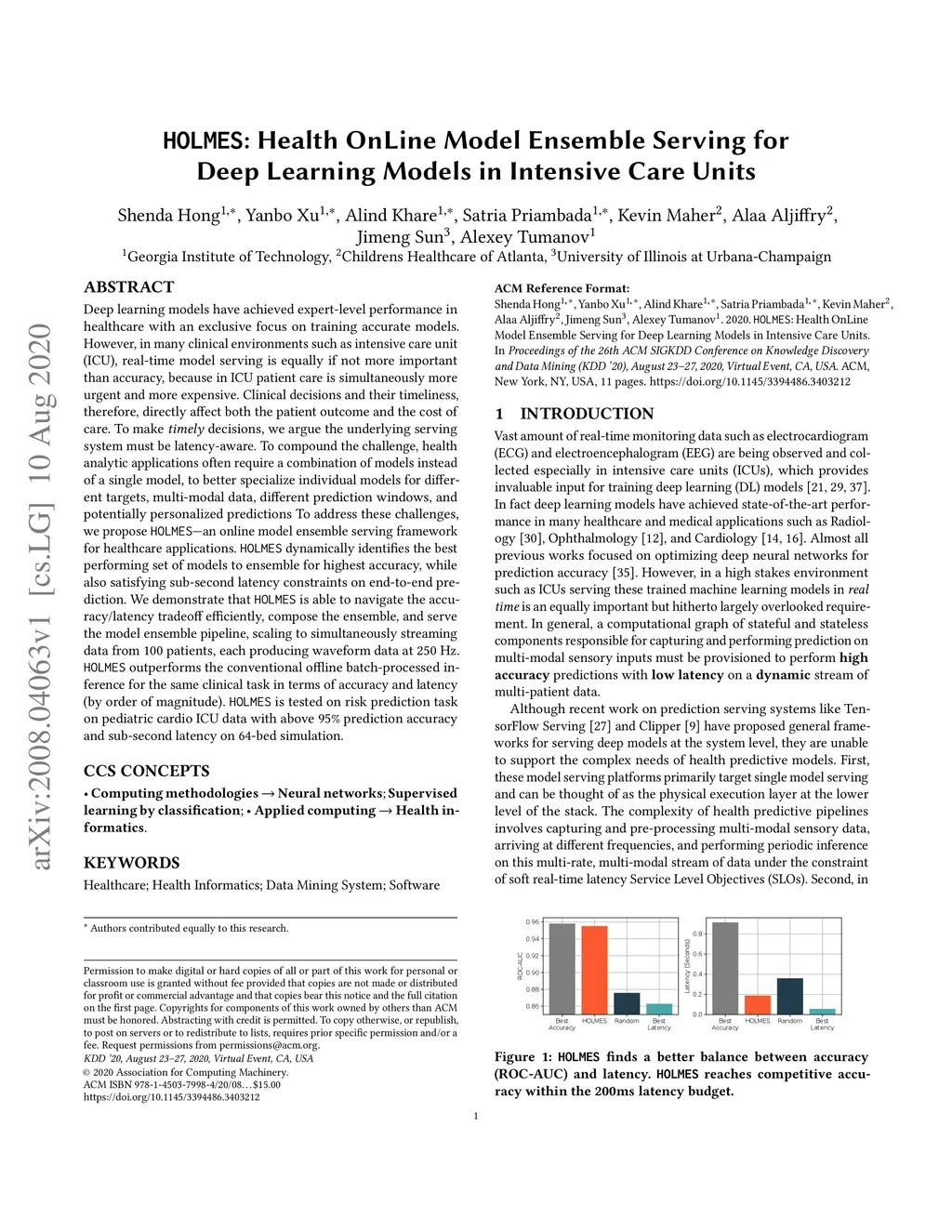 Deep learning models have achieved expert-level performance in healthcare with an exclusive focus on training accurate models. However, in many clinical environments such as intensive care unit (ICU), real-time model serving is equally if not more important than accuracy, because in ICU patient care is simultaneously more urgent and more expensive. Clinical decisions and their timeliness, therefore, directly affect both the patient outcome and the cost of care. To make timely decisions, we argue the underlying serving system must be latency-aware. To compound the challenge, health analytic applications often require a combination of models instead of a single model, to better specialize individual models for different targets, multi-modal data, different prediction windows, and potentially personalized predictions. To address these challenges, we propose HOLMES-an online model ensemble serving framework for healthcare applications. HOLMES dynamically identifies the best performing set of models to ensemble for highest accuracy, while also satisfying sub-second latency constraints on end-to-end prediction. We demonstrate that HOLMES is able to navigate the accuracy/latency tradeoff efficiently, compose the ensemble, and serve the model ensemble pipeline, scaling to simultaneously streaming data from 100 patients, each producing waveform data at 250~Hz. HOLMES outperforms the conventional offline batch-processed inference for the same clinical task in terms of accuracy and latency (by order of magnitude). HOLMES is tested on risk prediction task on pediatric cardio ICU data with above 95% prediction accuracy and sub-second latency on 64-bed simulation.