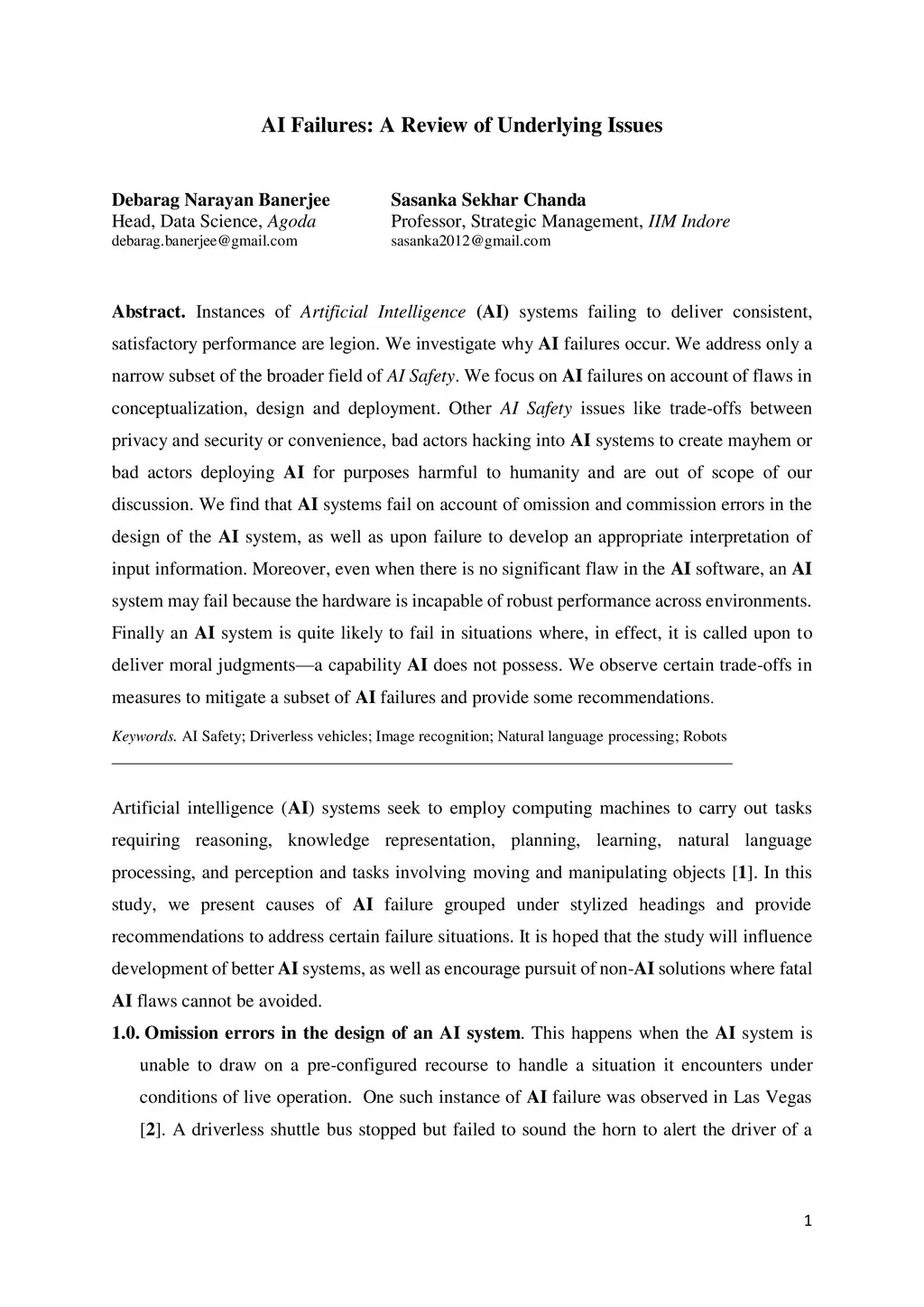 Instances of Artificial Intelligence (AI) systems failing to deliver consistent, satisfactory performance are legion. We investigate why AI failures occur. We address only a narrow subset of the broader field of AI Safety. We focus on AI failures on account of flaws in conceptualization, design and deployment. Other AI Safety issues like trade-offs between privacy and security or convenience, bad actors hacking into AI systems to create mayhem or bad actors deploying AI for purposes harmful to humanity and are out of scope of our discussion. We find that AI systems fail on account of omission and commission errors in the design of the AI system, as well as upon failure to develop an appropriate interpretation of input information. Moreover, even when there is no significant flaw in the AI software, an AI system may fail because the hardware is incapable of robust performance across environments. Finally an AI system is quite likely to fail in situations where, in effect, it is called upon to deliver moral judgments -- a capability AI does not possess. We observe certain trade-offs in measures to mitigate a subset of AI failures and provide some recommendations.