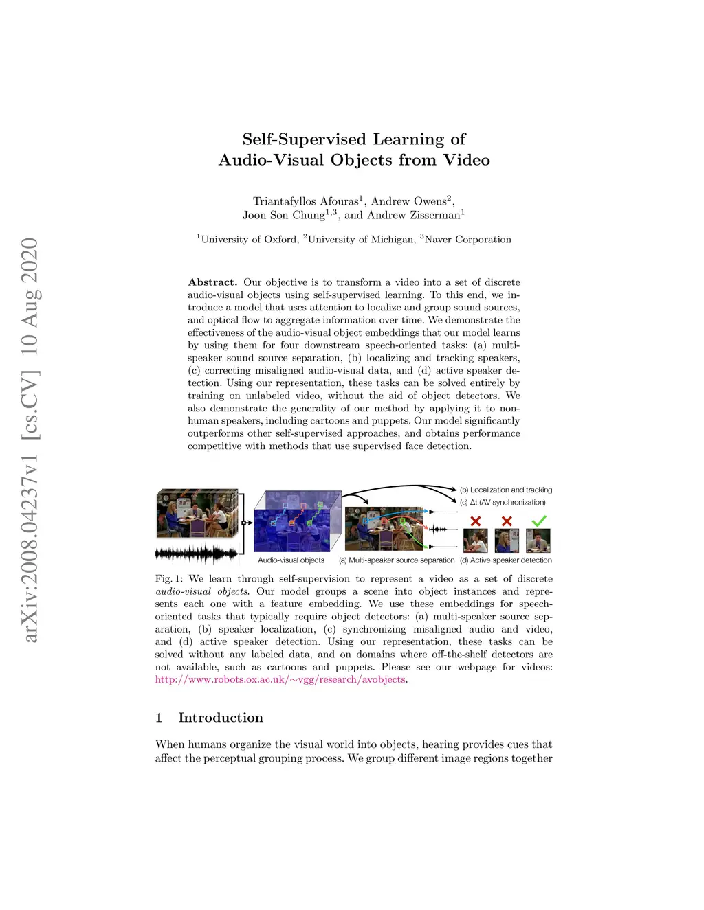Our objective is to transform a video into a set of discrete audio-visual objects using self-supervised learning. To this end, we introduce a model that uses attention to localize and group sound sources, and optical flow to aggregate information over time. We demonstrate the effectiveness of the audio-visual object embeddings that our model learns by using them for four downstream speech-oriented tasks: (a) multi-speaker sound source separation, (b) localizing and tracking speakers, (c) correcting misaligned audio-visual data, and (d) active speaker detection. Using our representation, these tasks can be solved entirely by training on unlabeled video, without the aid of object detectors. We also demonstrate the generality of our method by applying it to non-human speakers, including cartoons and puppets.Our model significantly outperforms other self-supervised approaches, and obtains performance competitive with methods that use supervised face detection.