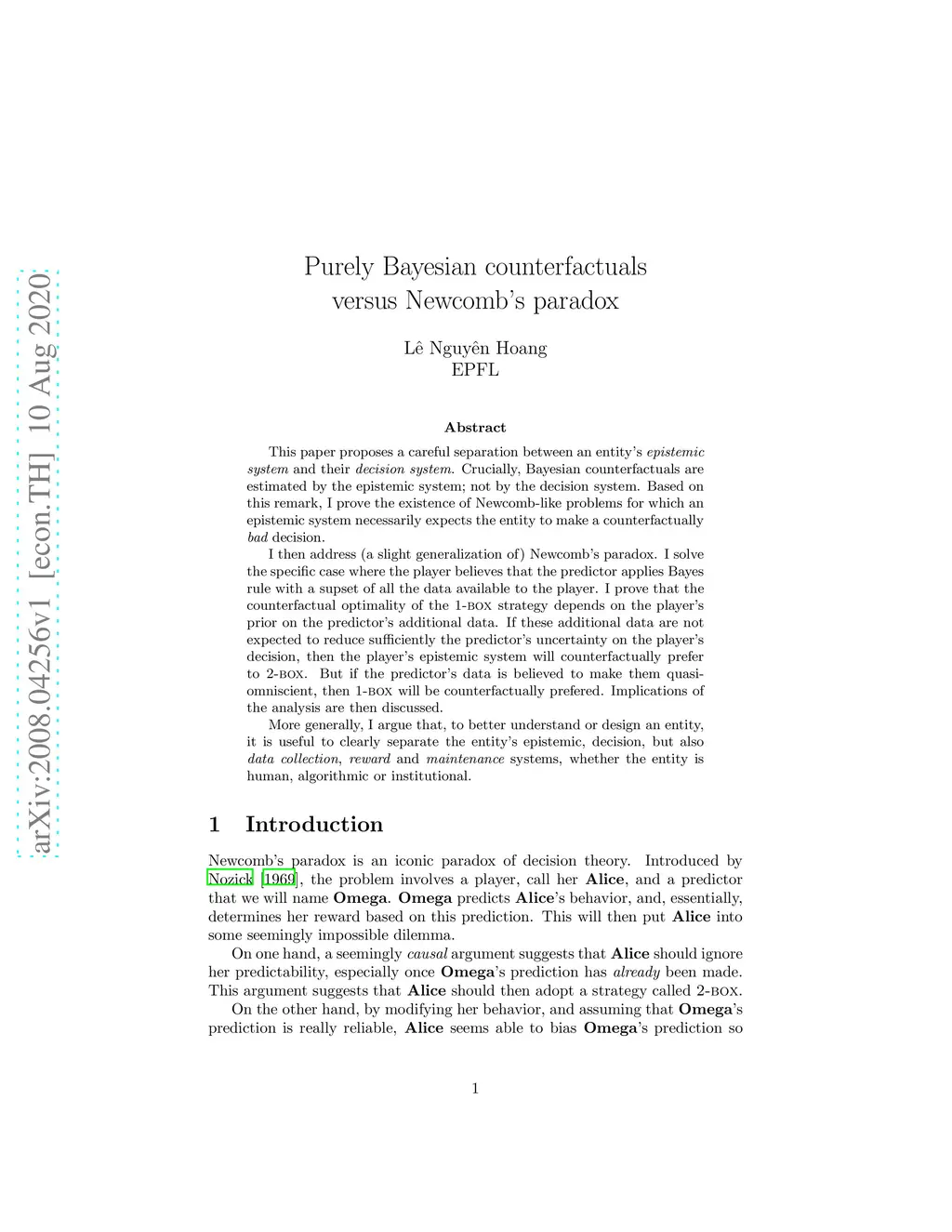 This paper proposes a careful separation between an entity's epistemic system and their decision system. Crucially, Bayesian counterfactuals are estimated by the epistemic system; not by the decision system. Based on this remark, I prove the existence of Newcomb-like problems for which an epistemic system necessarily expects the entity to make a counterfactually bad decision. I then address (a slight generalization of) Newcomb's paradox. I solve the specific case where the player believes that the predictor applies Bayes rule with a supset of all the data available to the player. I prove that the counterfactual optimality of the 1-Box strategy depends on the player's prior on the predictor's additional data. If these additional data are not expected to reduce sufficiently the predictor's uncertainty on the player's decision, then the player's epistemic system will counterfactually prefer to 2-Box. But if the predictor's data is believed to make them quasi-omniscient, then 1-Box will be counterfactually preferred. Implications of the analysis are then discussed. More generally, I argue that, to better understand or design an entity, it is useful to clearly separate the entity's epistemic, decision, but also data collection, reward and maintenance systems, whether the entity is human, algorithmic or institutional.