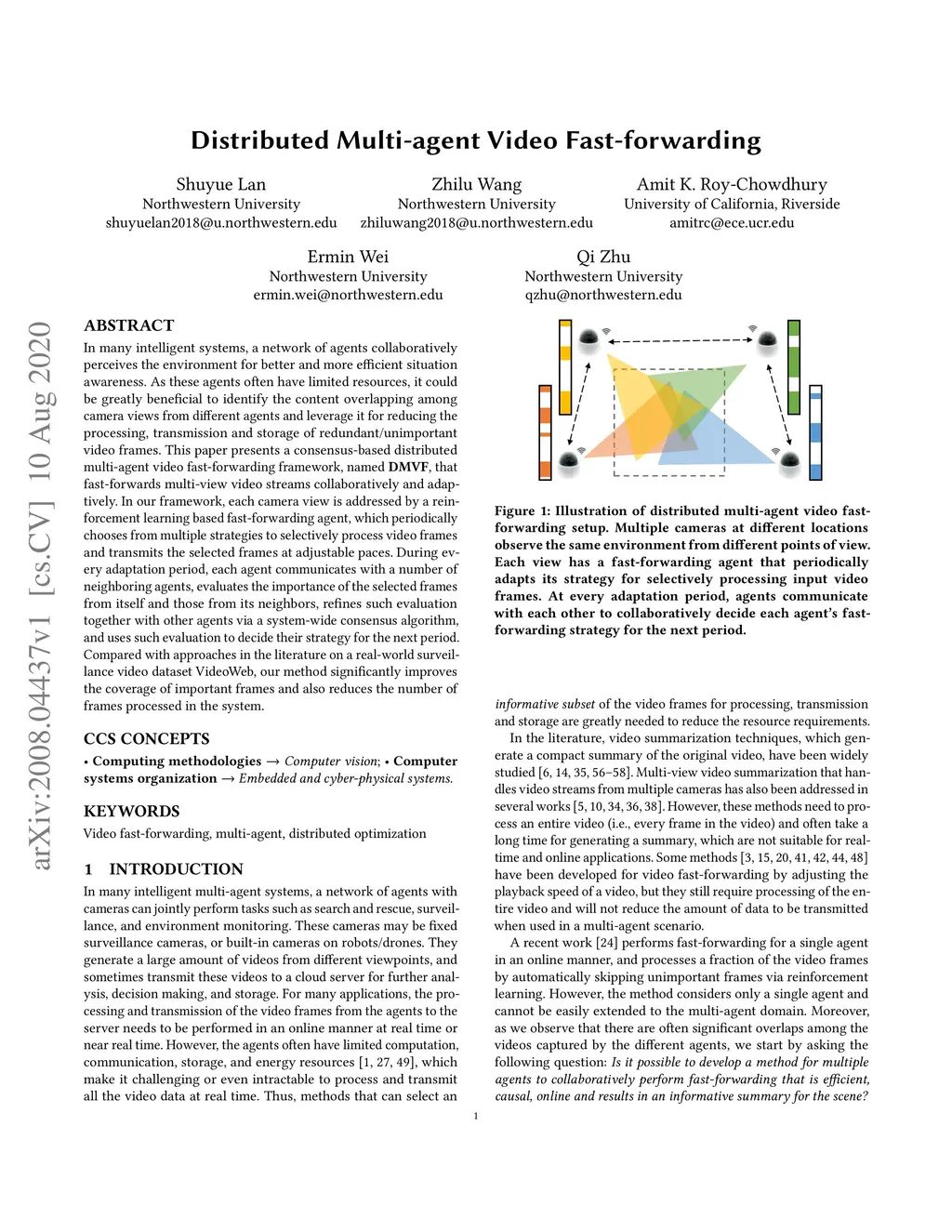 In many intelligent systems, a network of agents collaboratively perceives the environment for better and more efficient situation awareness. As these agents often have limited resources, it could be greatly beneficial to identify the content overlapping among camera views from different agents and leverage it for reducing the processing, transmission and storage of redundant/unimportant video frames. This paper presents a consensus-based distributed multi-agent video fast-forwarding framework, named DMVF, that fast-forwards multi-view video streams collaboratively and adaptively. In our framework, each camera view is addressed by a reinforcement learning based fast-forwarding agent, which periodically chooses from multiple strategies to selectively process video frames and transmits the selected frames at adjustable paces. During every adaptation period, each agent communicates with a number of neighboring agents, evaluates the importance of the selected frames from itself and those from its neighbors, refines such evaluation together with other agents via a system-wide consensus algorithm, and uses such evaluation to decide their strategy for the next period. Compared with approaches in the literature on a real-world surveillance video dataset VideoWeb, our method significantly improves the coverage of important frames and also reduces the number of frames processed in the system.