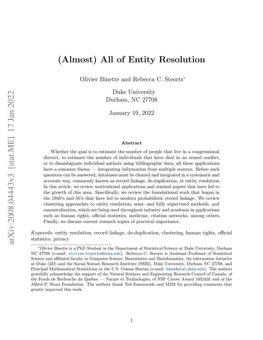 Whether the goal is to estimate the number of people that live in a congressional district, to estimate the number of individuals that have died in an armed conflict, or to disambiguate individual authors using bibliographic data, all these applications have a common theme - integrating information from multiple sources. Before such questions can be answered, databases must be cleaned and integrated in a systematic and accurate way, commonly known as record linkage, de-duplication, or entity resolution. In this article, we review motivational applications and seminal papers that have led to the growth of this area. Specifically, we review the foundational work that began in the 1940's and 50's that have led to modern probabilistic record linkage. We review clustering approaches to entity resolution, semi- and fully supervised methods, and canonicalization, which are being used throughout industry and academia in applications such as human rights, official statistics, medicine, citation networks, among others. Finally, we discuss current research topics of practical importance.